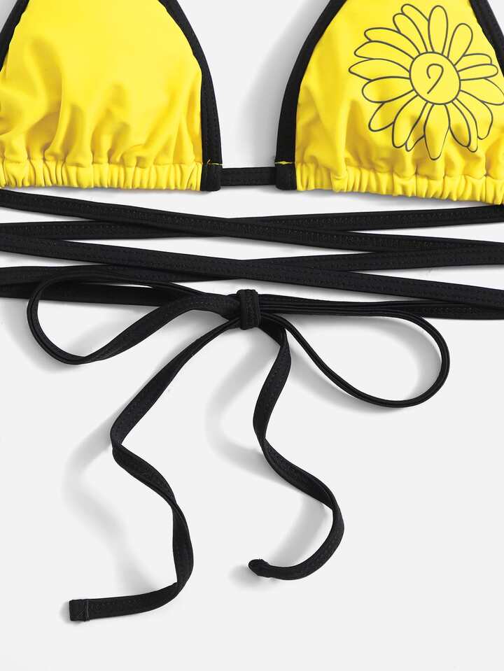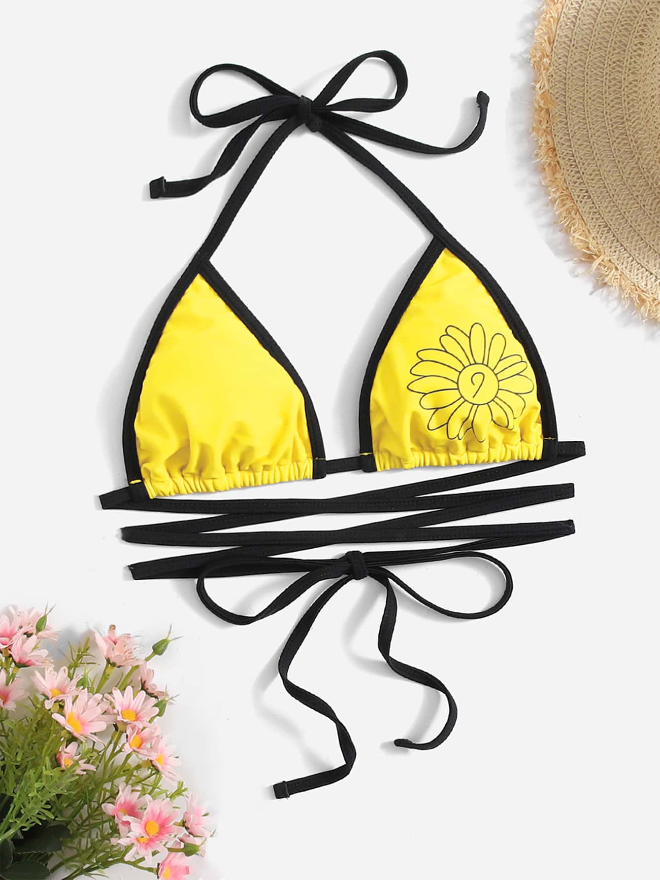 Floral Graphic Contrast Binding Criss Cross Halter Bikini Top