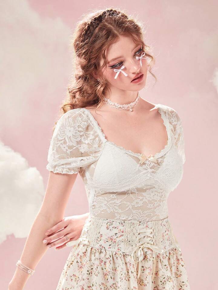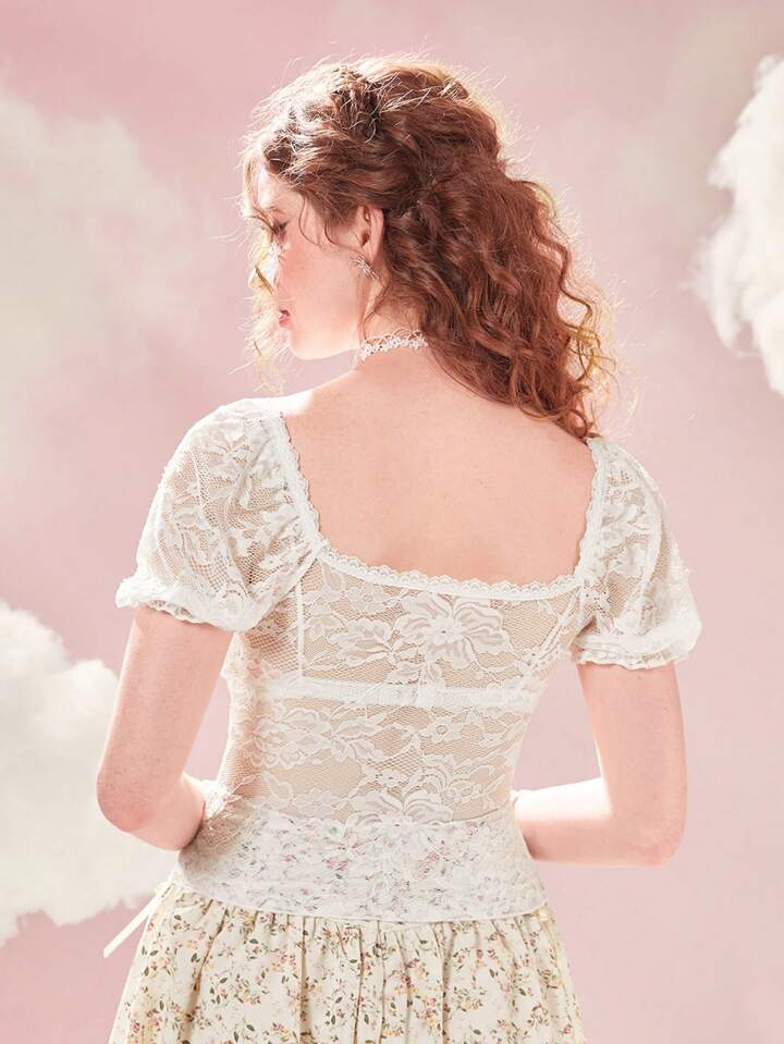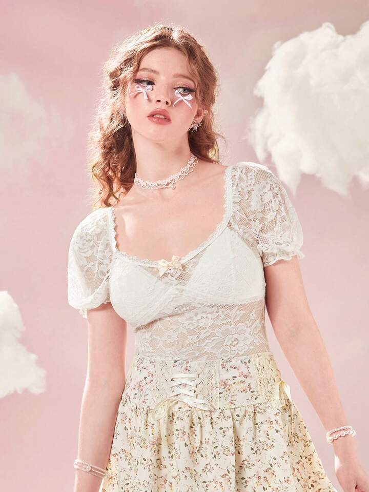 Floral Lace Bow Decor Puff Sleeve Crop Top