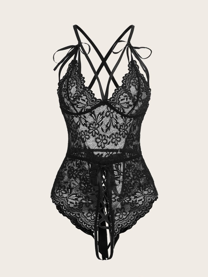 Floral Lace Criss Cross Cut Out Teddy Bodysuit