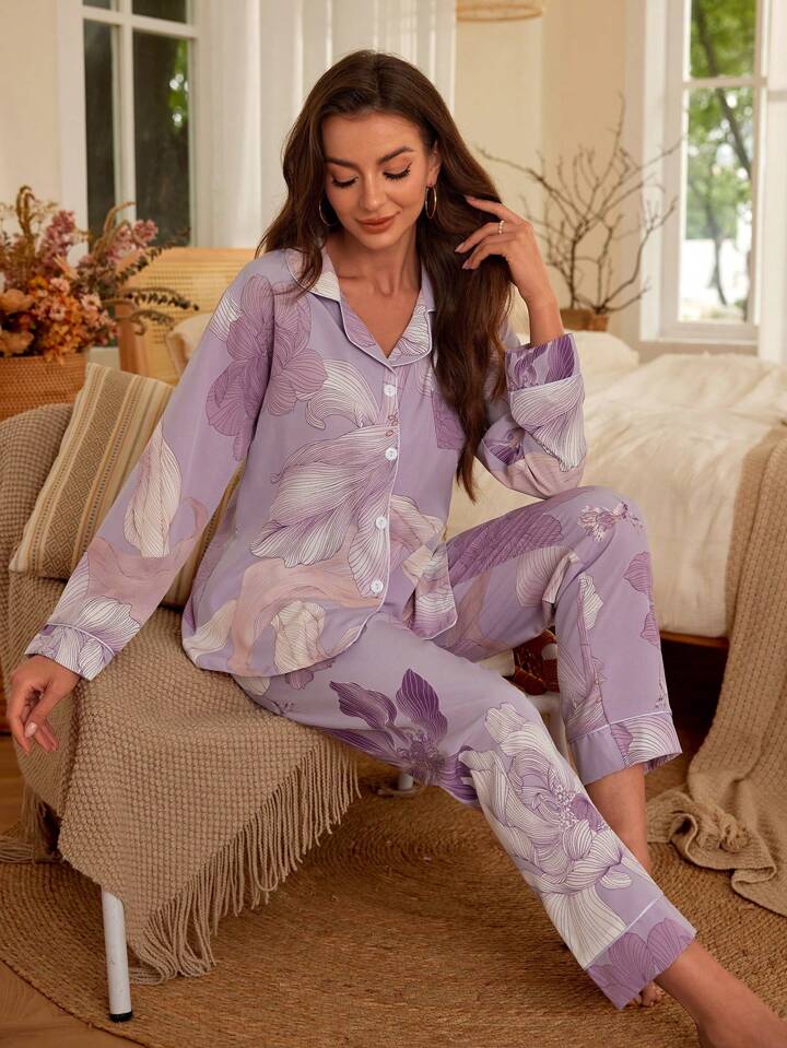 Floral Print Contrast Piping Patched Pocket PJ Set / Pajama Set Holiday Season