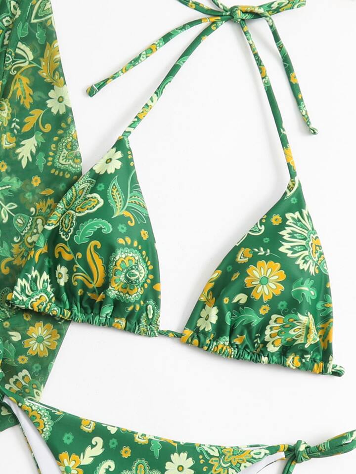 Floral Print Halter Triangle Summer Beach Bikini Set With Cover Up