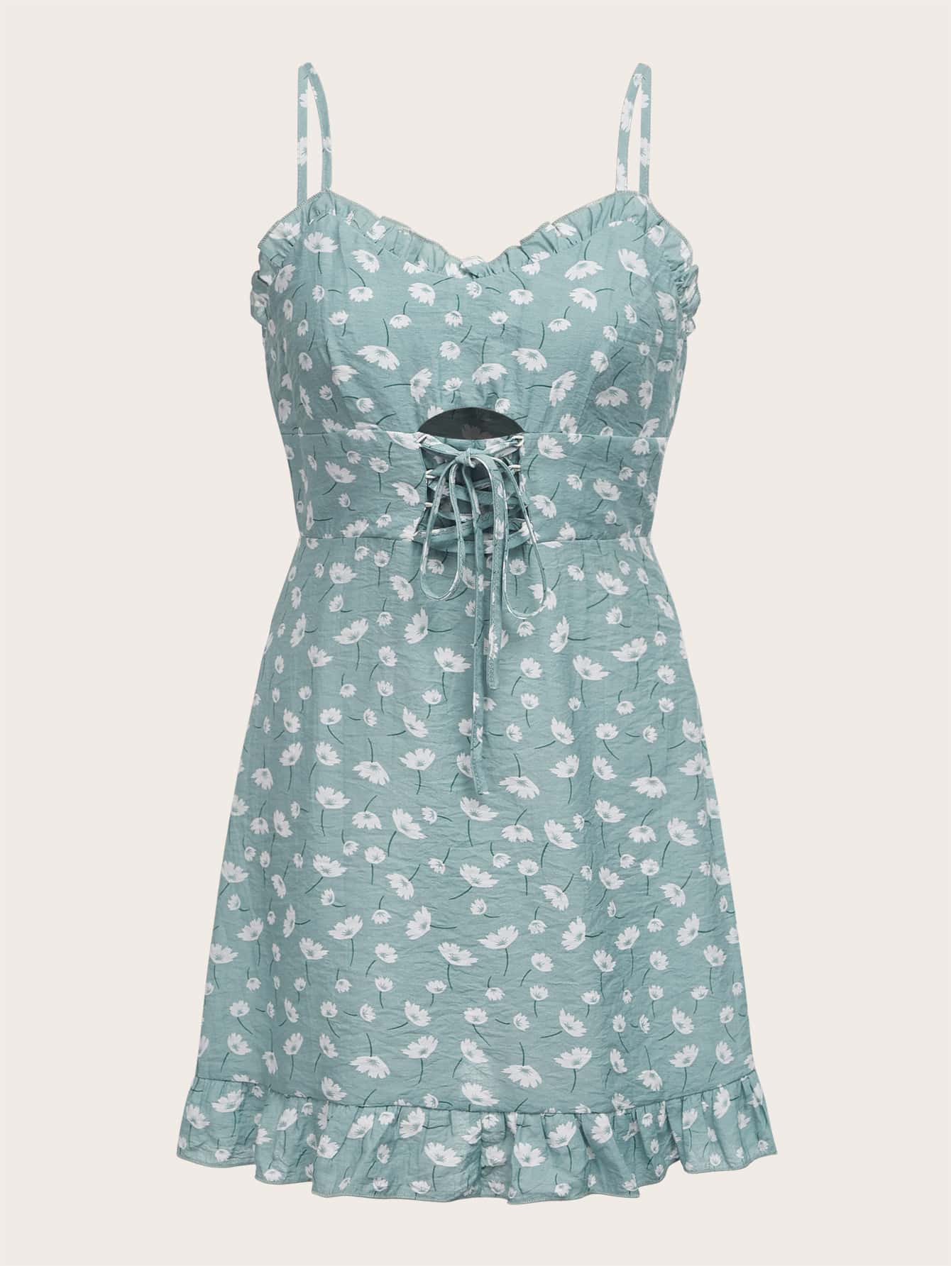 Floral Print Lace Up Ruffle Hem Cami Dress
