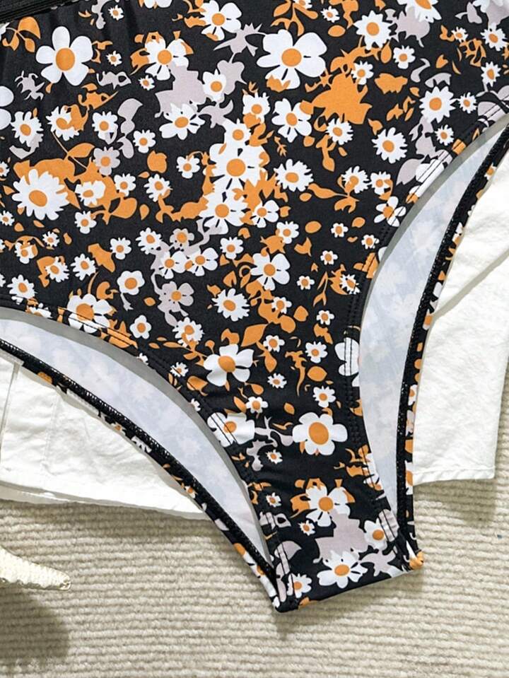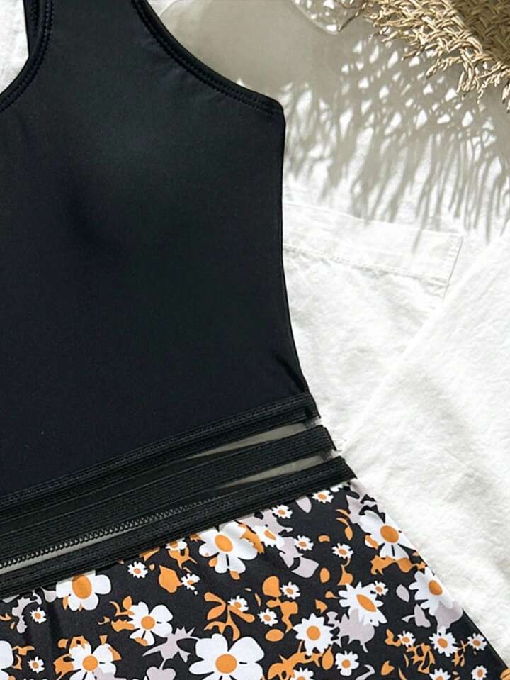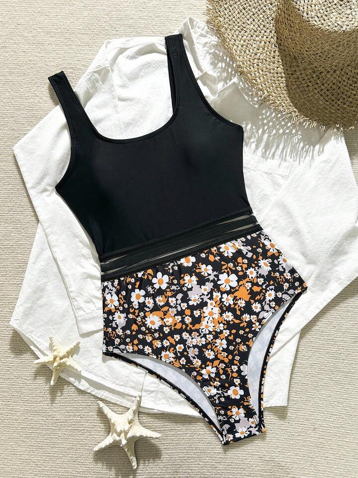 Floral Print Mesh Insert One Piece Swimsuit,Summer Beach