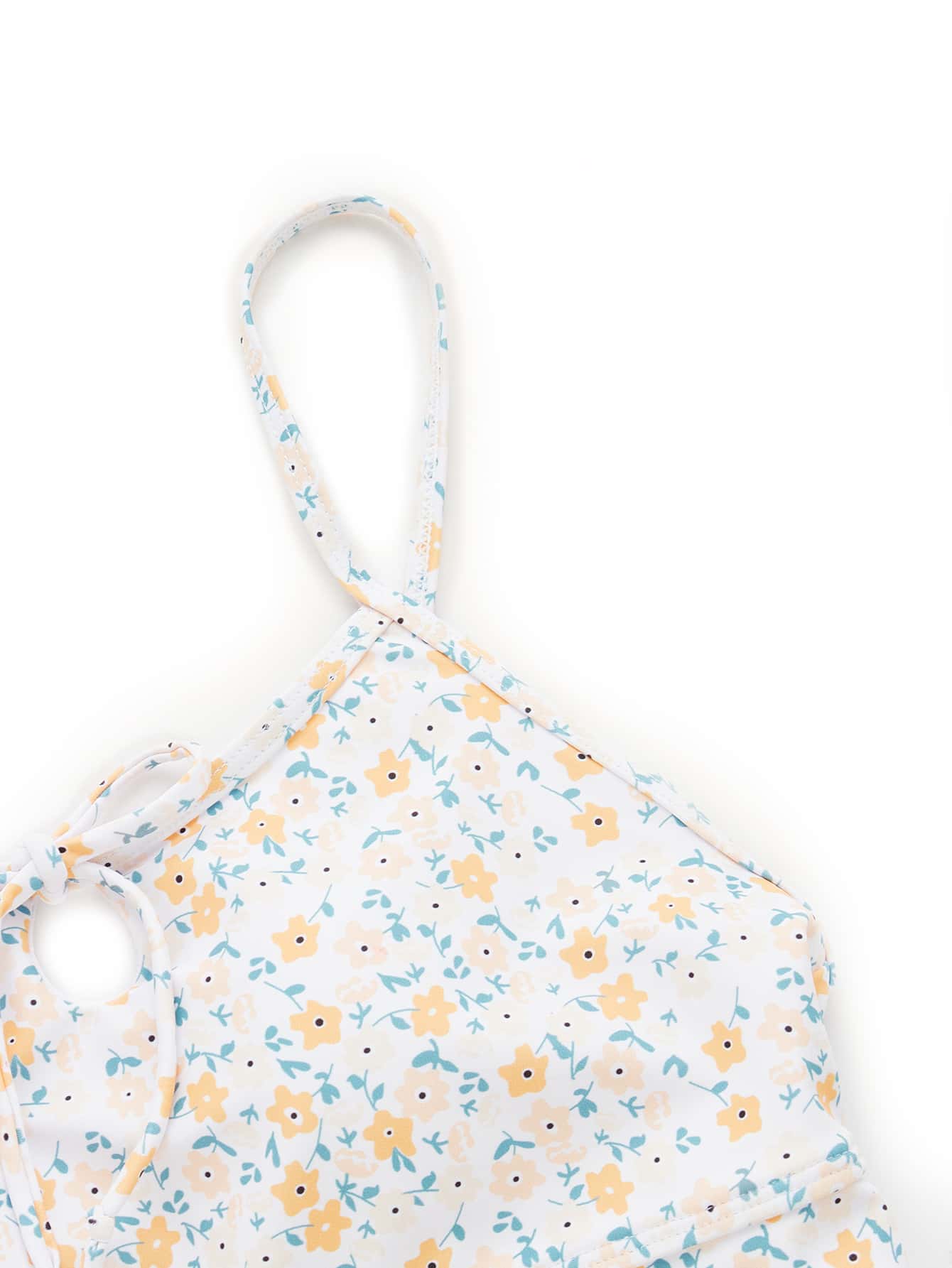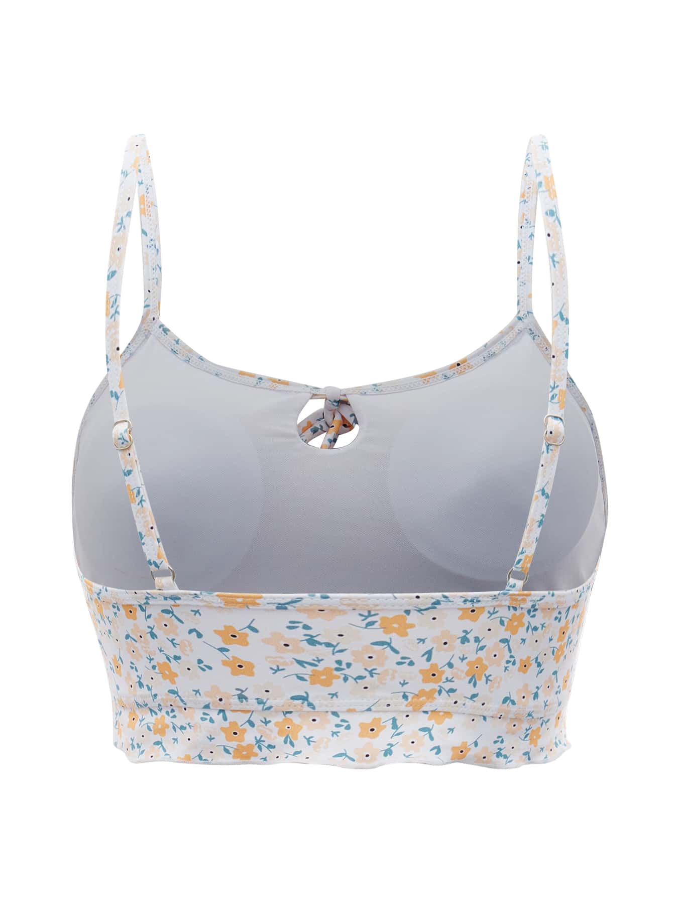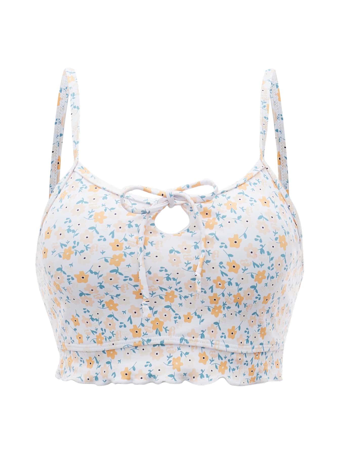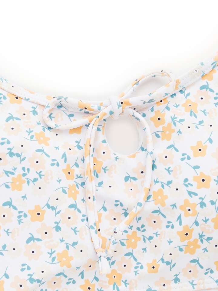 Floral Print Tie Front Lettuce Trim Bikini Top