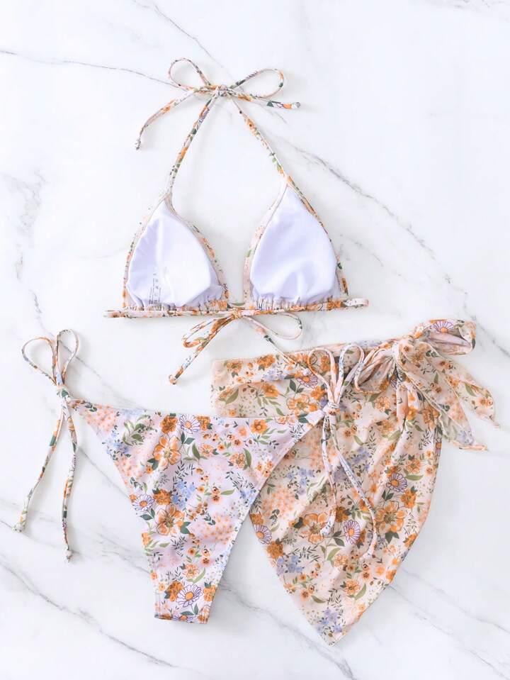 Floral Triangle Tie Side Bikini Set With Beach Skirt