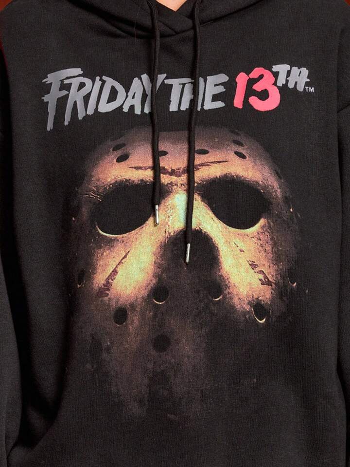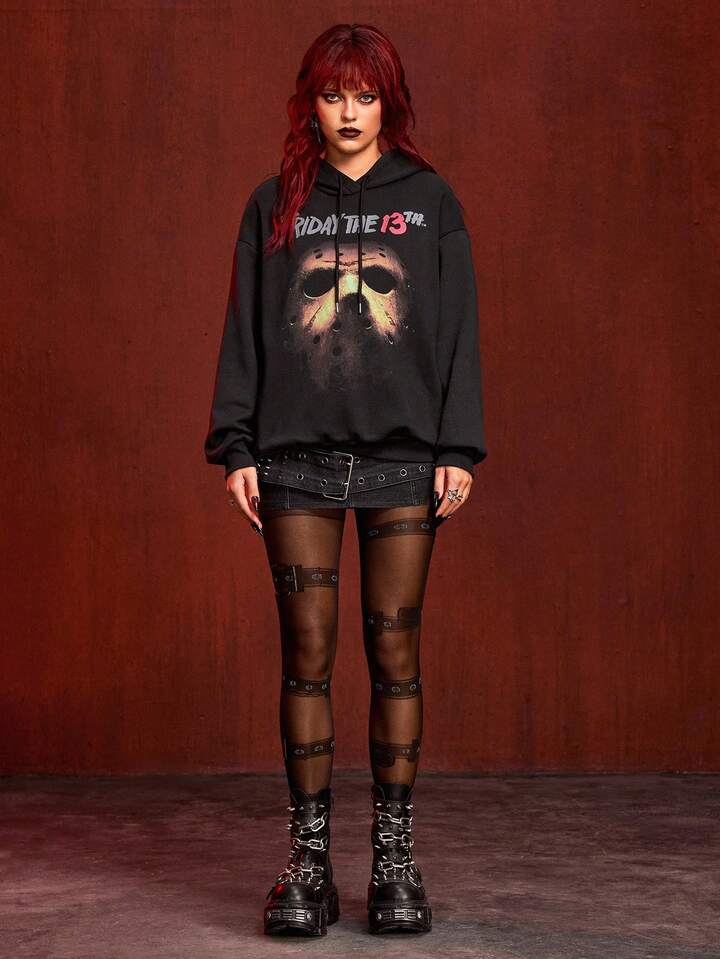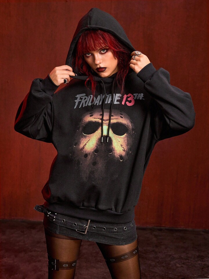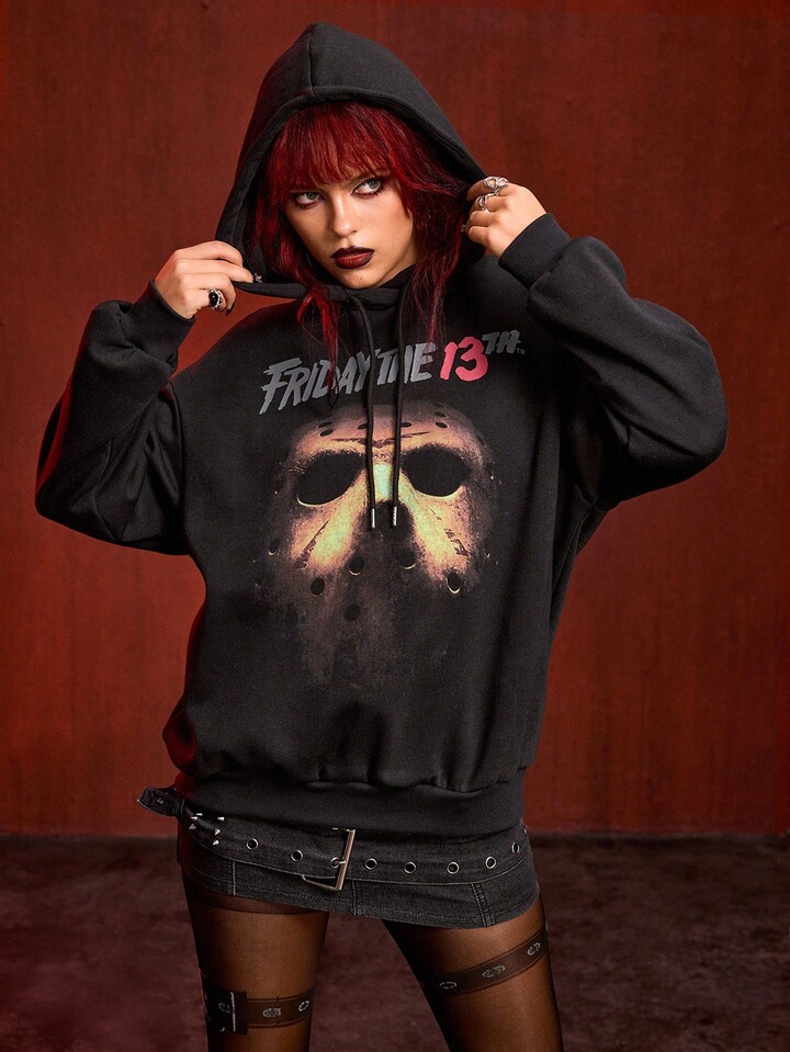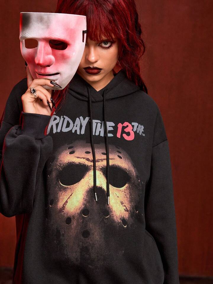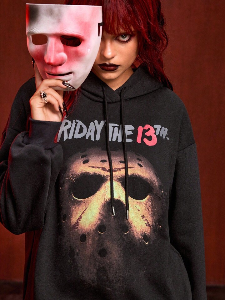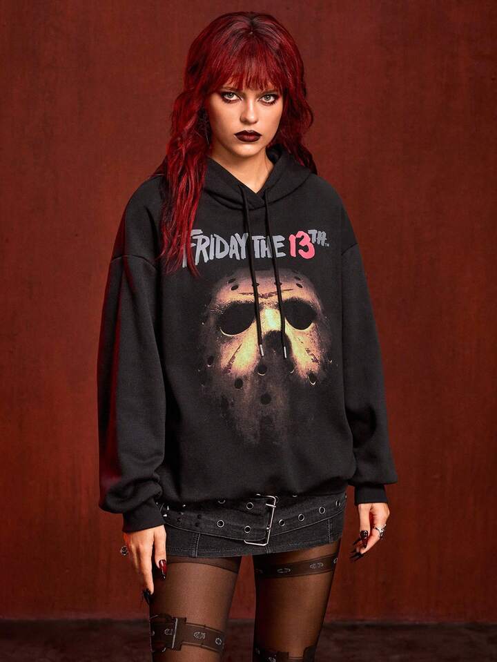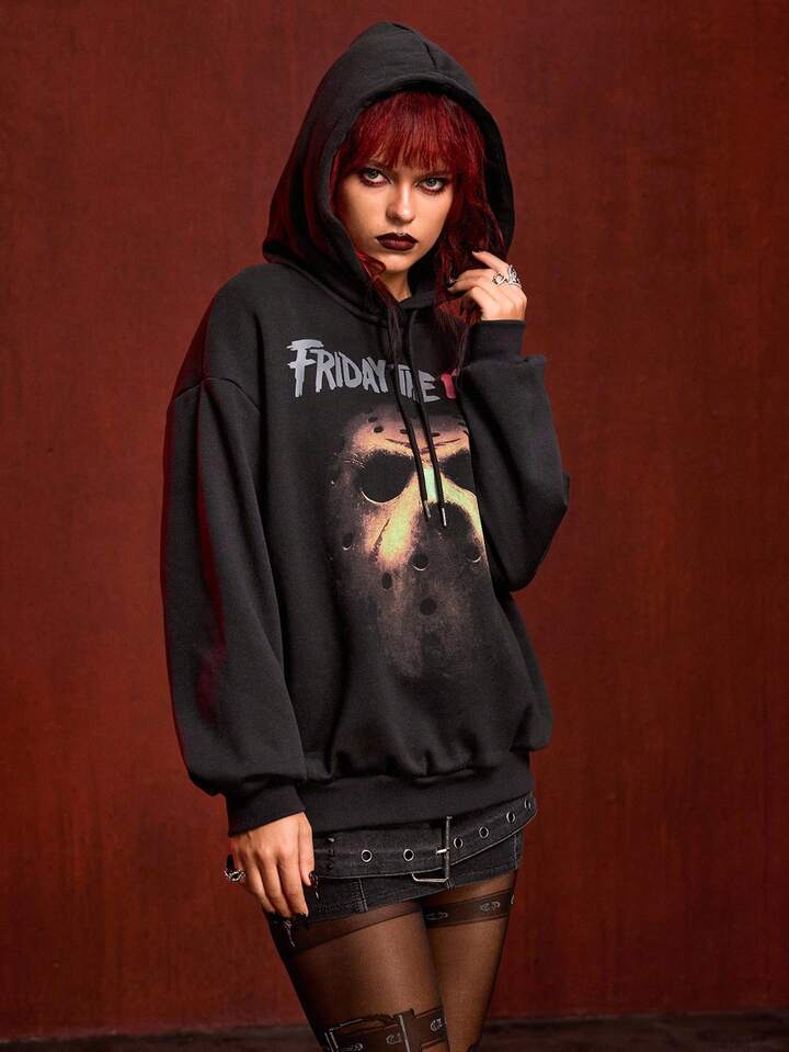Friday the 13th X ROMWE Letter & Mask Graphic Hooded Long Sleeve Sweatshirt For Women