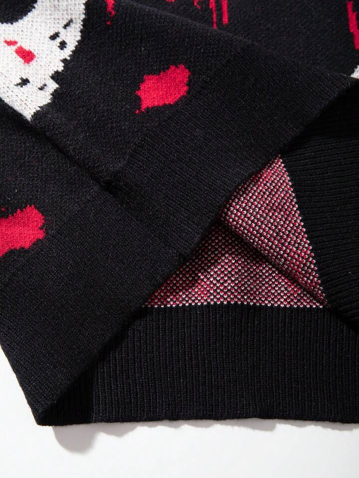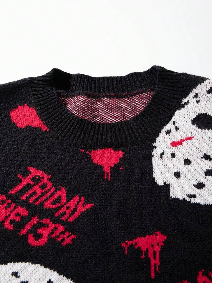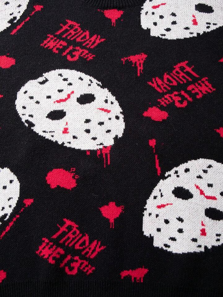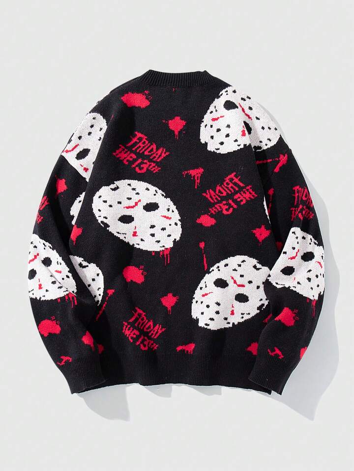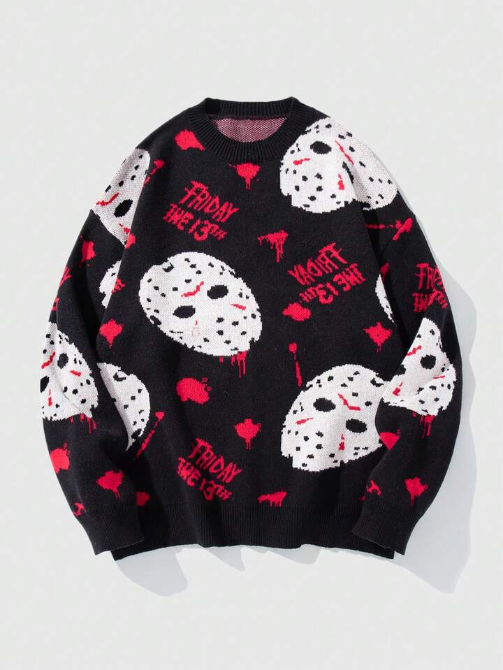 Friday the 13th X ROMWE Men's Casual Fashion Street Loose Fit Oversized Mask Pattern Sweater, Autumn/Winter