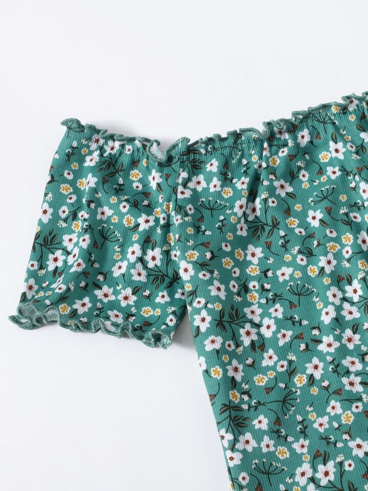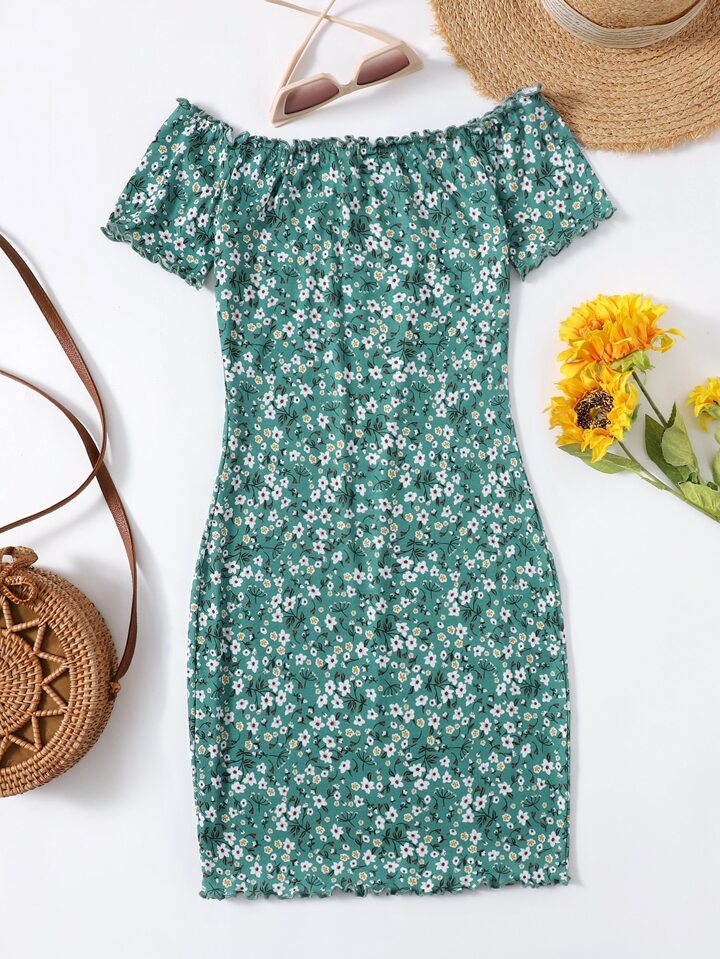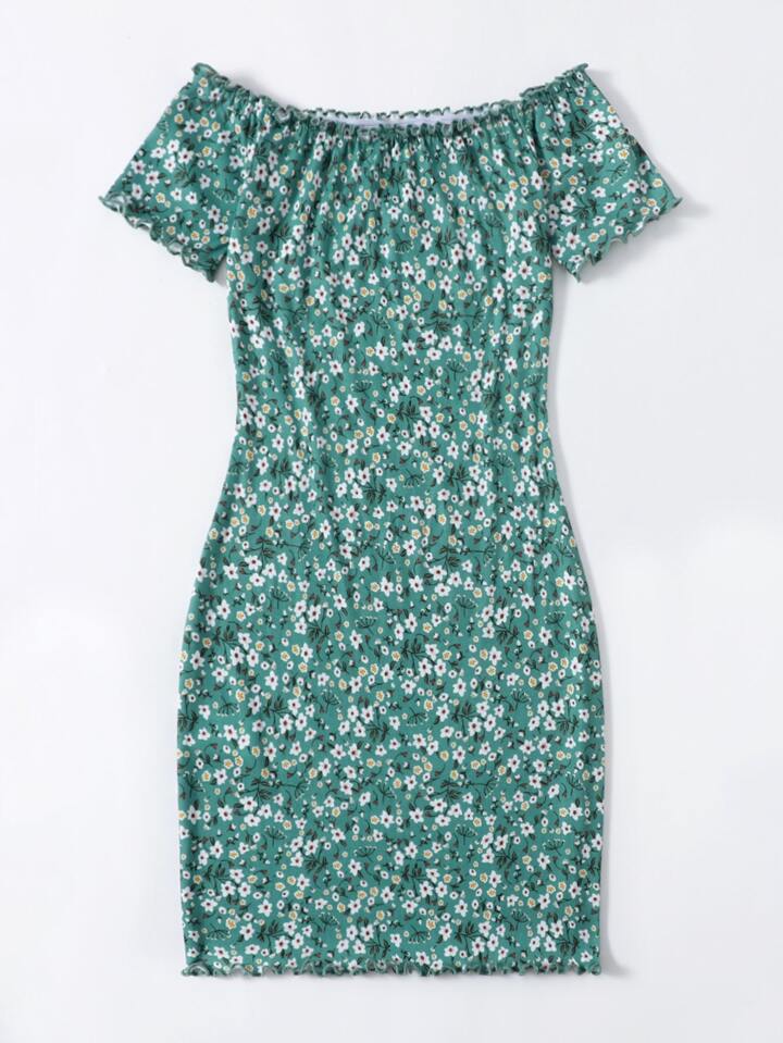 Frilled Off Shoulder Lettuce Trim Ditsy Floral Bodycon Dress