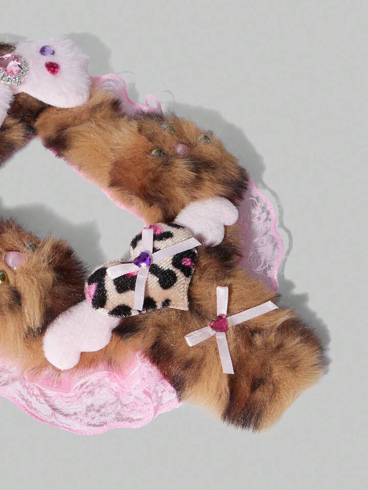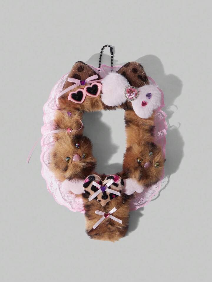 Furry Leopard Print Pink Bow Heart Rhinestone Lace Flower Bag Charm, Casual Fashion Anime Style Multi-Purpose Card Holder (ID Card, Photo, Etc.)