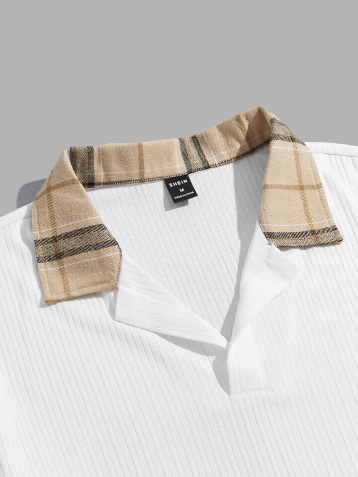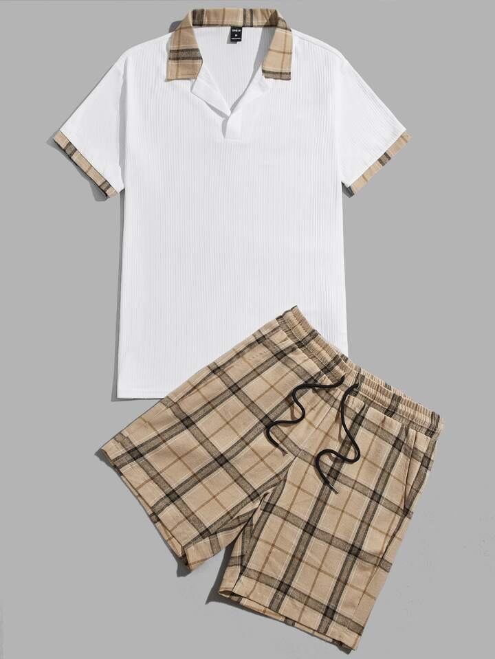 GENTILAND Guys Plaid Print Contrast Collar Tee & Drawstring Waist Shorts