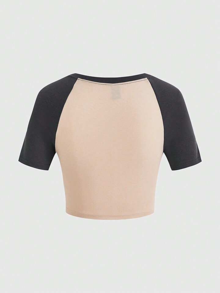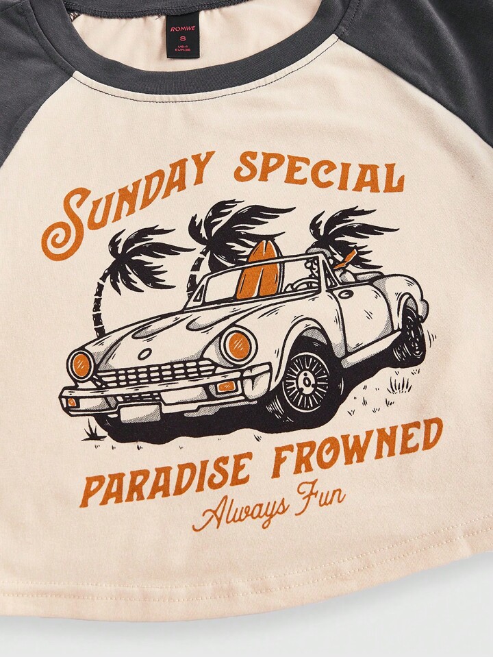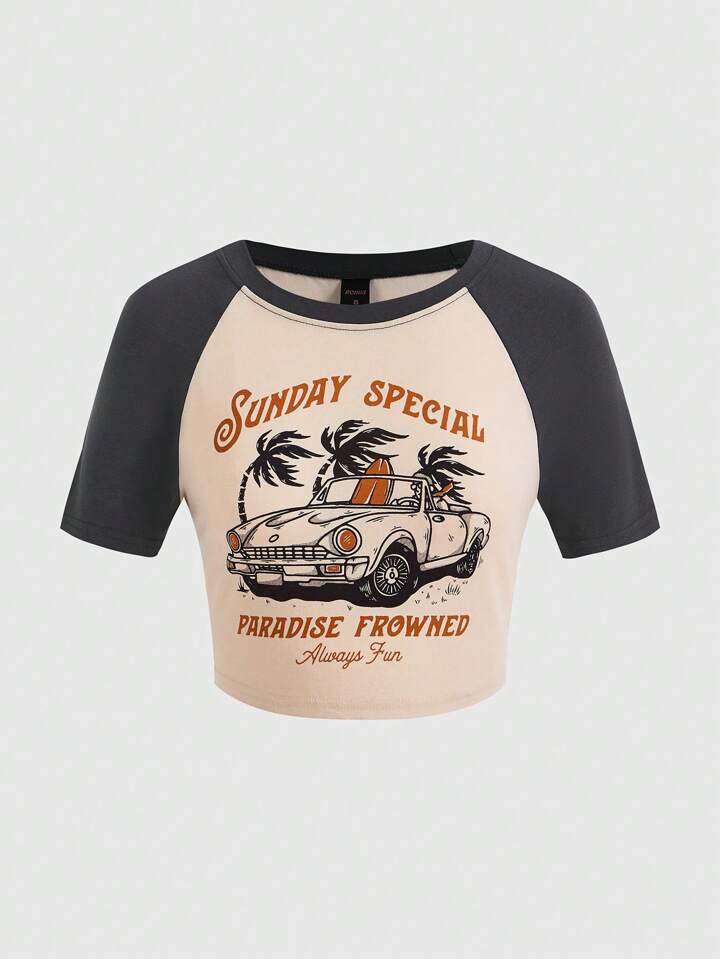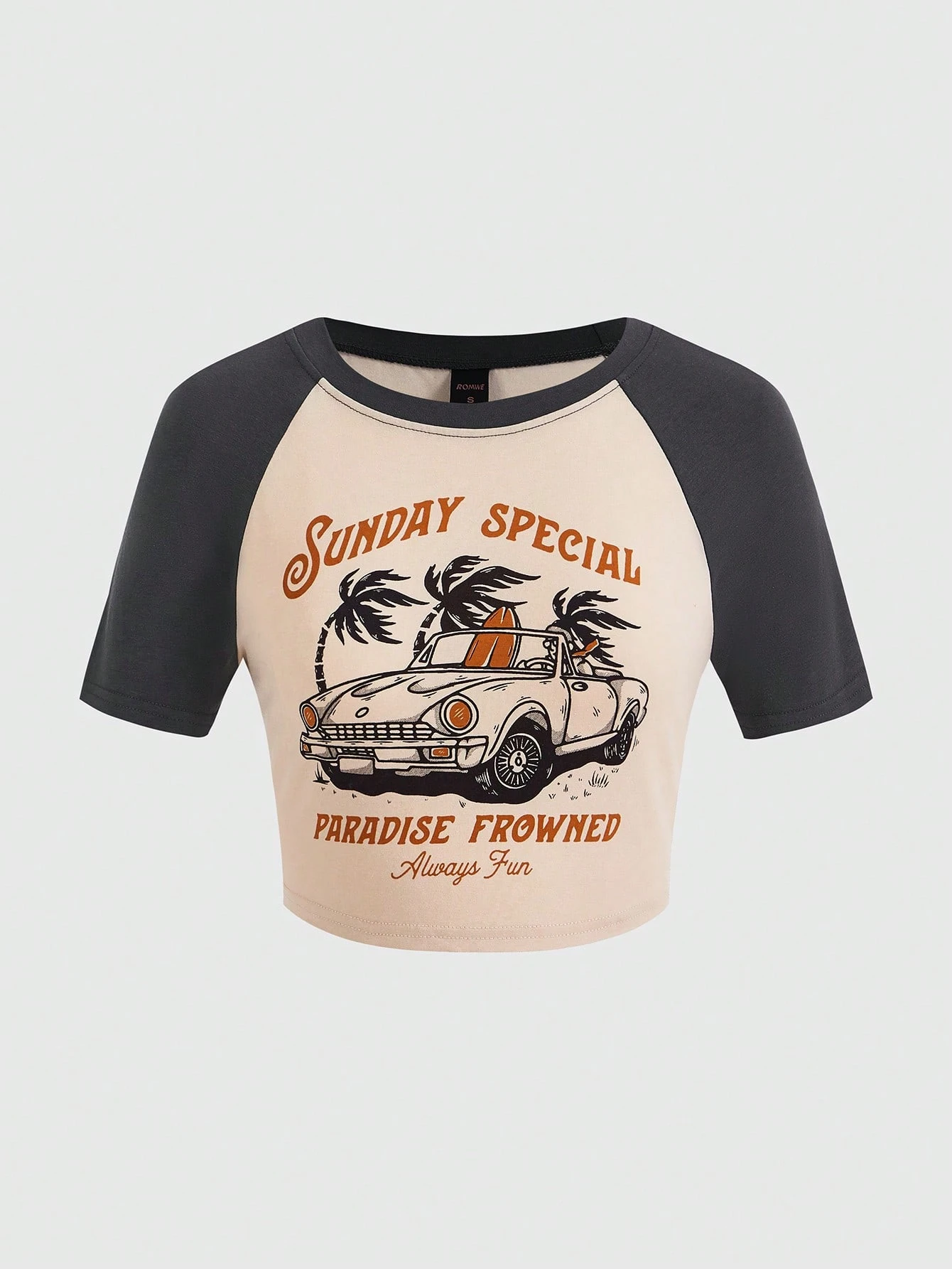 GOLDENLINE Car & Letter Graphic Raglan Sleeve Crop Tee