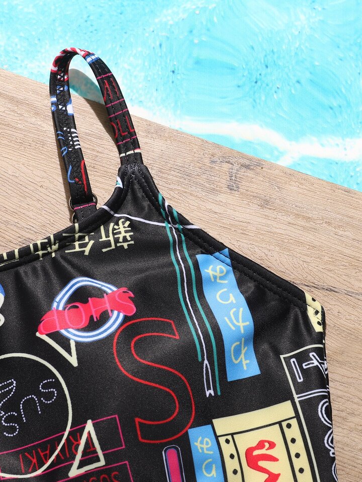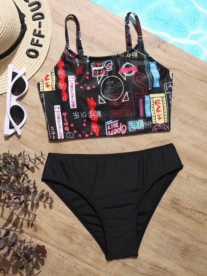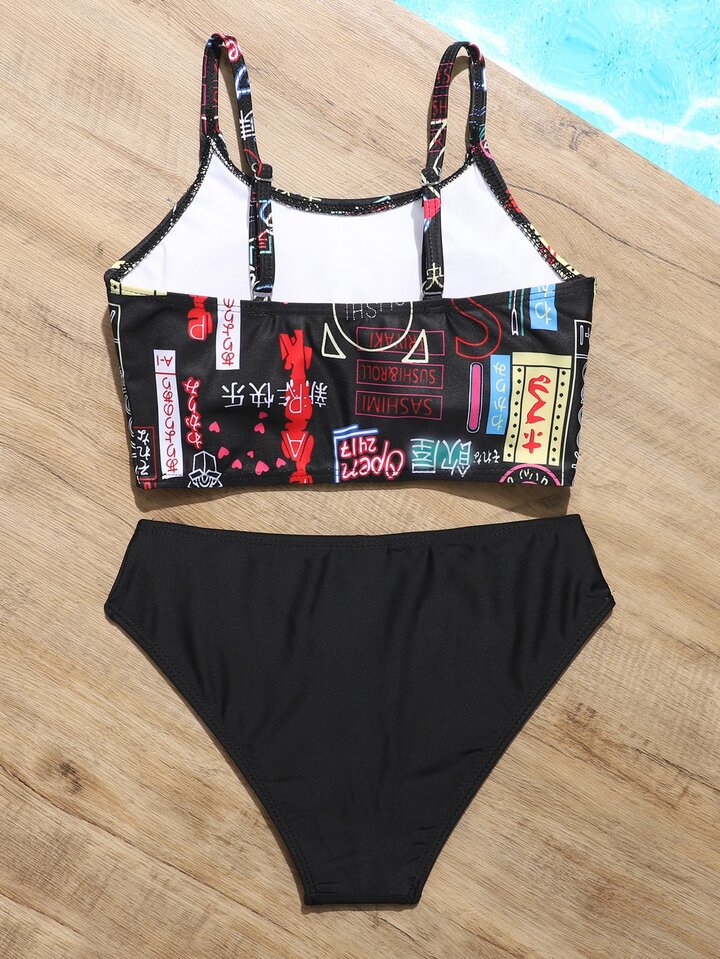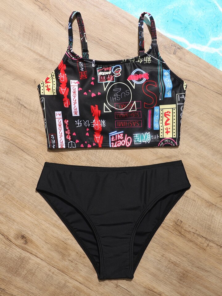 Tween Girl Chinese & Japanese Letter Graphic Bikini Set Summer Beach