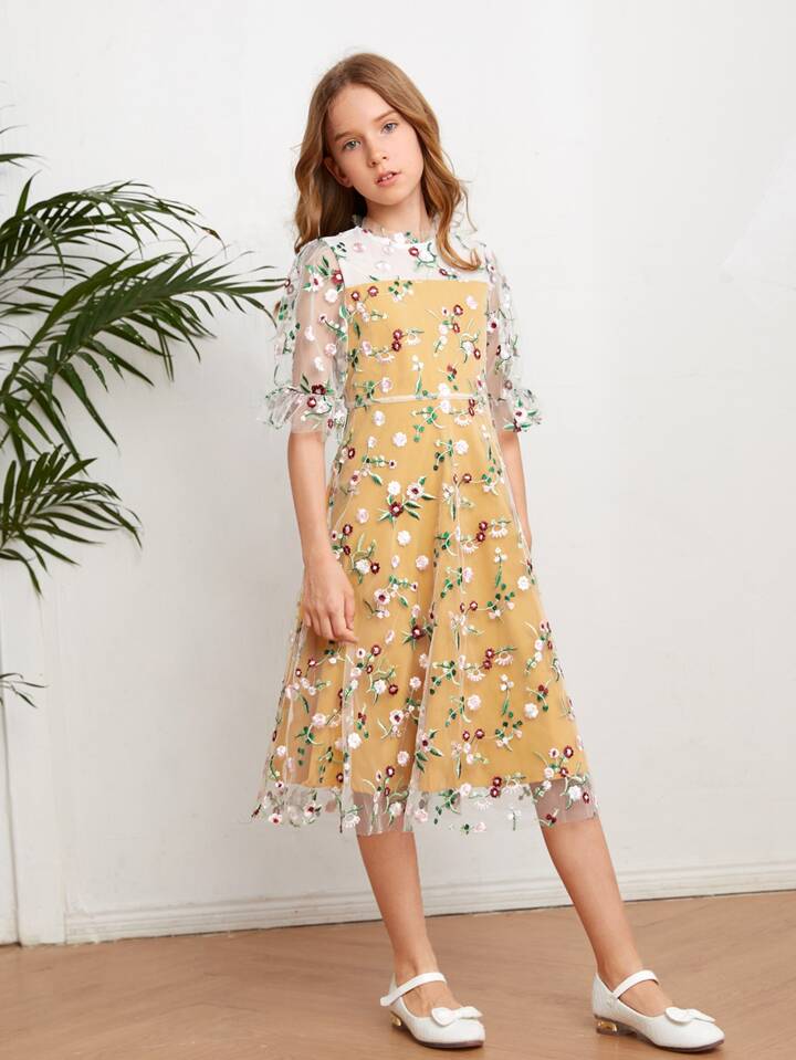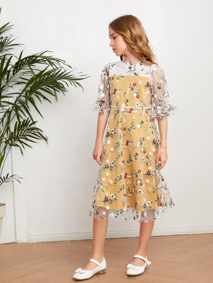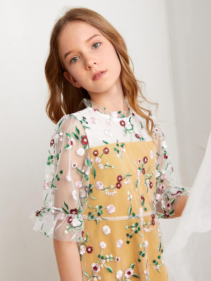 Girls Floral Embroidery Mesh Overlay Dress