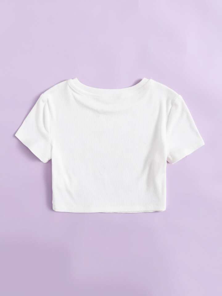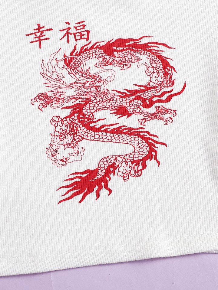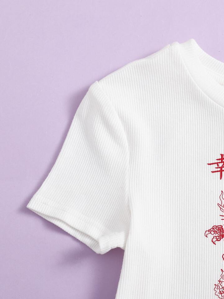 Girls Letter & Dragon Print Rib-knit Crop Tee