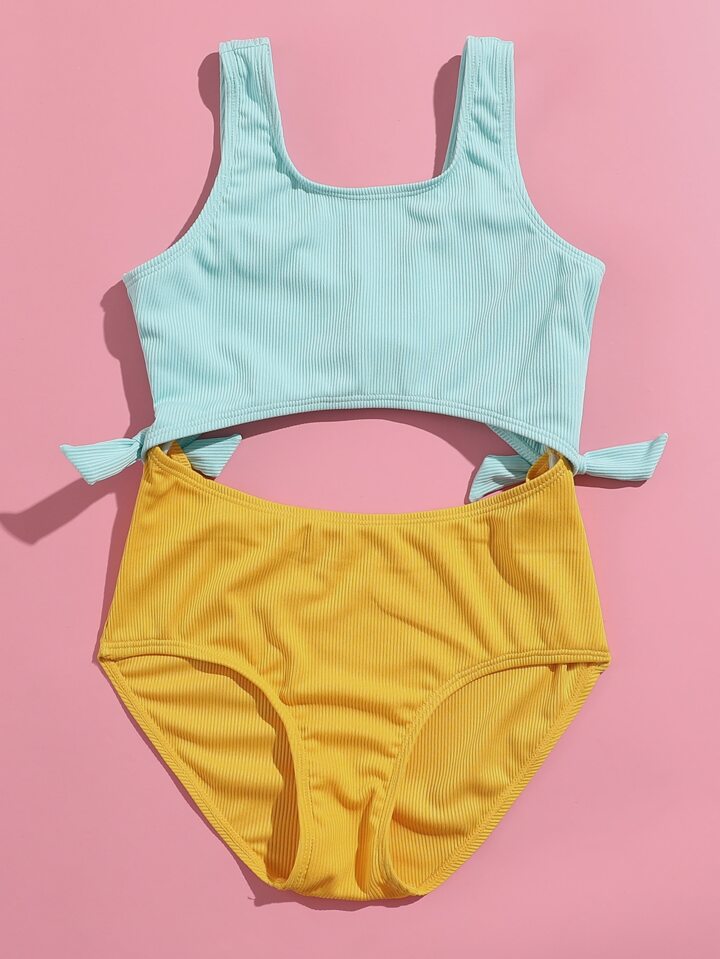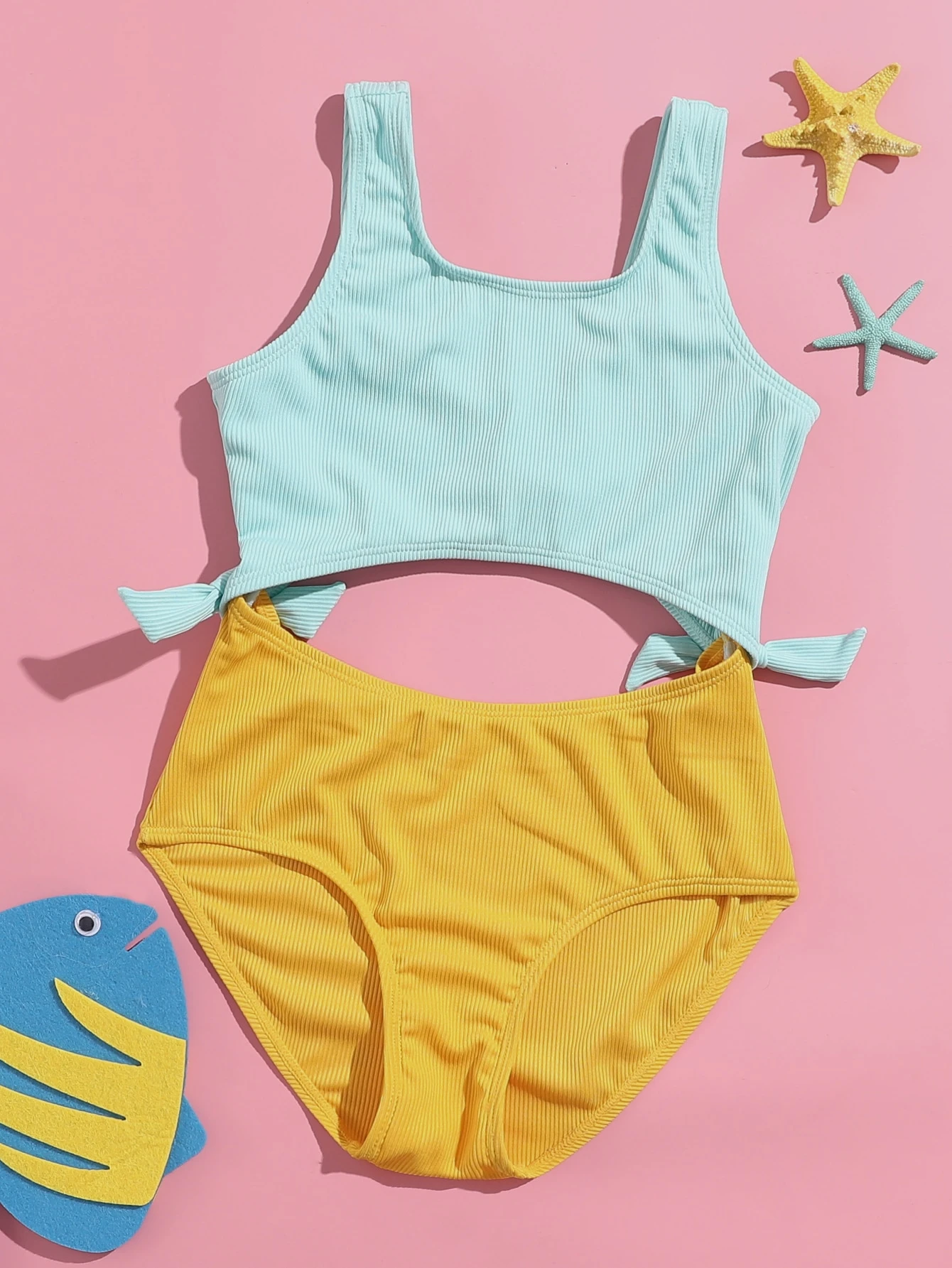 Girls Two Tone Rib Cut-out One Piece Swimsuit
