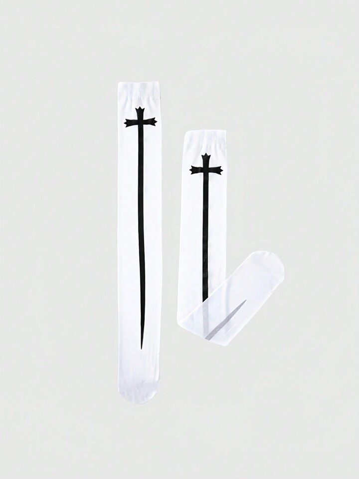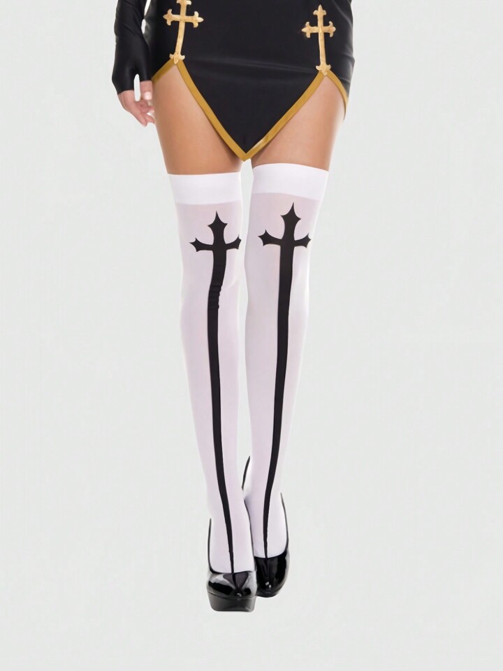 Goth 1 Pair Black Cross Print White Thigh High Stockings For Women, Cosplay