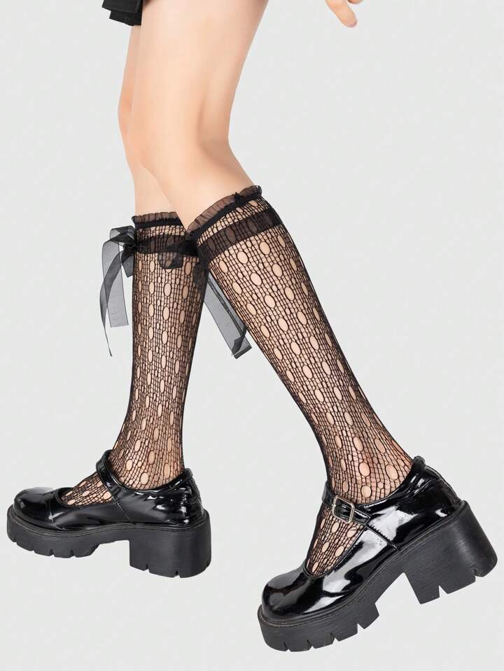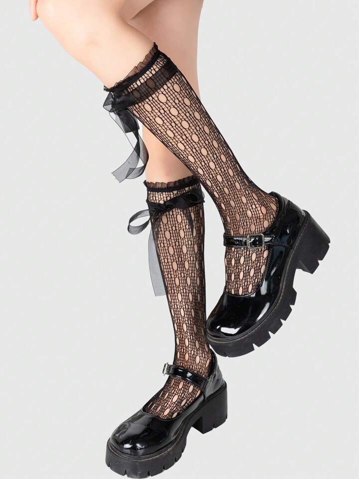 Goth 1 Pair Women Cute, Basics, Y2K, Lace, Mesh, Bow, Ruffle/Frill Lolita Butterfly Fishnet Crew Socks, Suitable For Casual, Party, School
