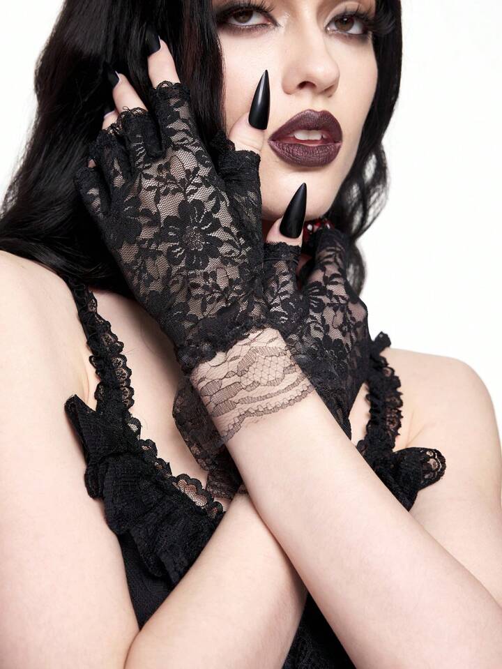 Goth 1 Pair Women Lace Trim Short Full Finger Gloves, Rose Bride Design, Black, Suitable For All Seasons