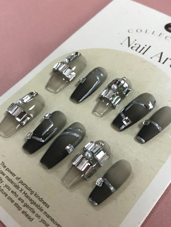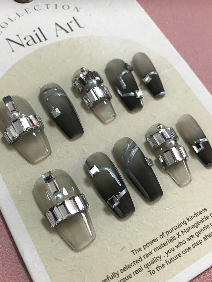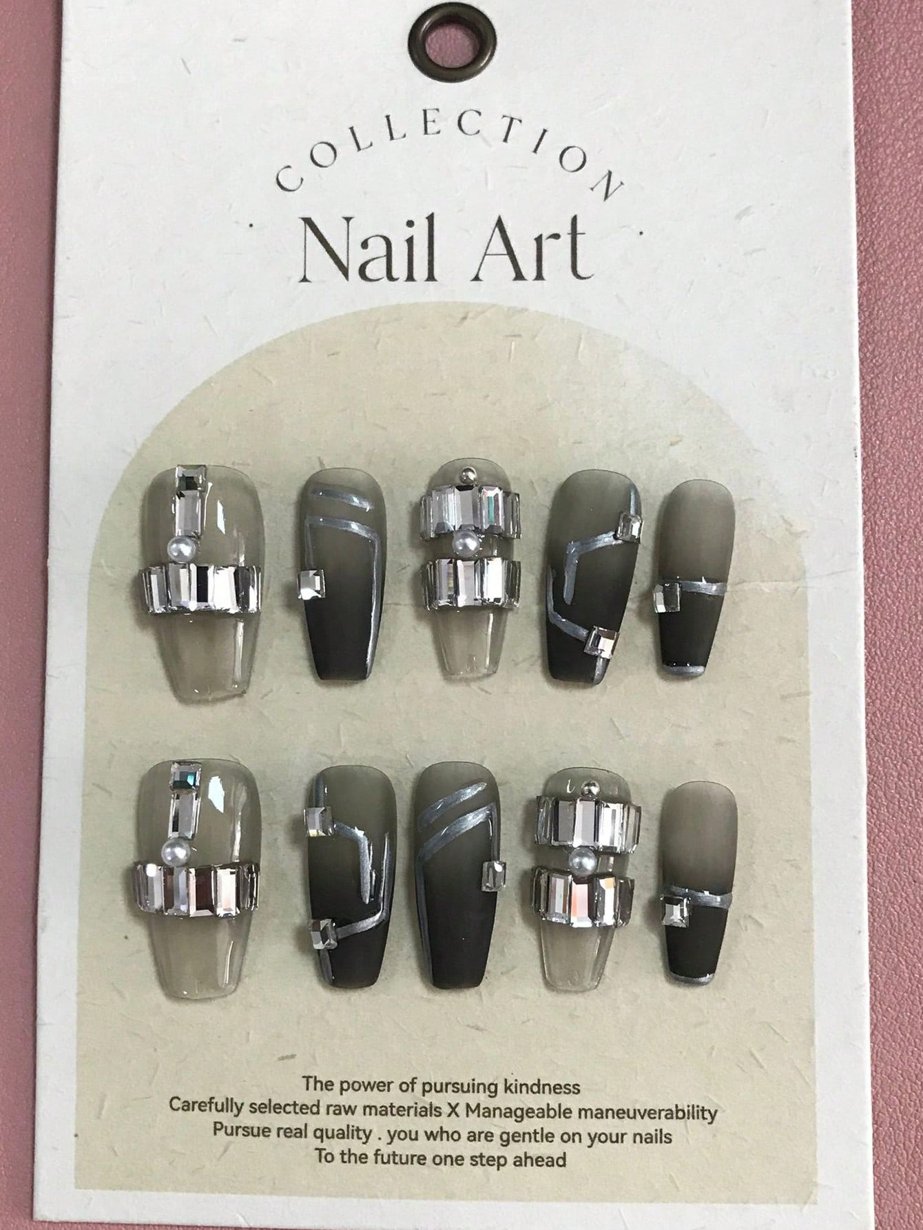 Goth 10pcs Long Coffin 3D Rhinestone Decor Fake Nail & 1sheet Tape