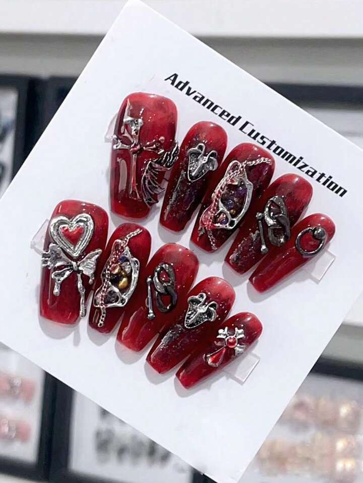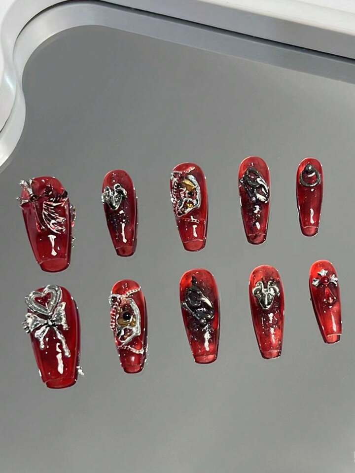 Goth 10pcs Long Coffin Cross Decor Fake Nail & 1sheet Tape