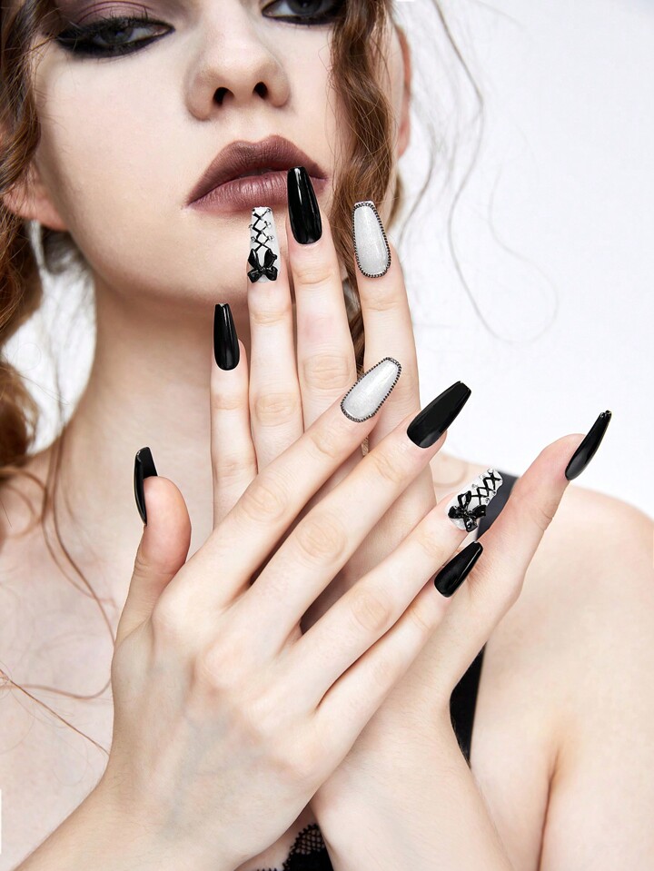 Goth 10pcs Opaque Black Lolita Bowknot Chain Nail Art With Rhinestones And Hand-Painted Design + 3 Pcs Double-Sided Adhesive