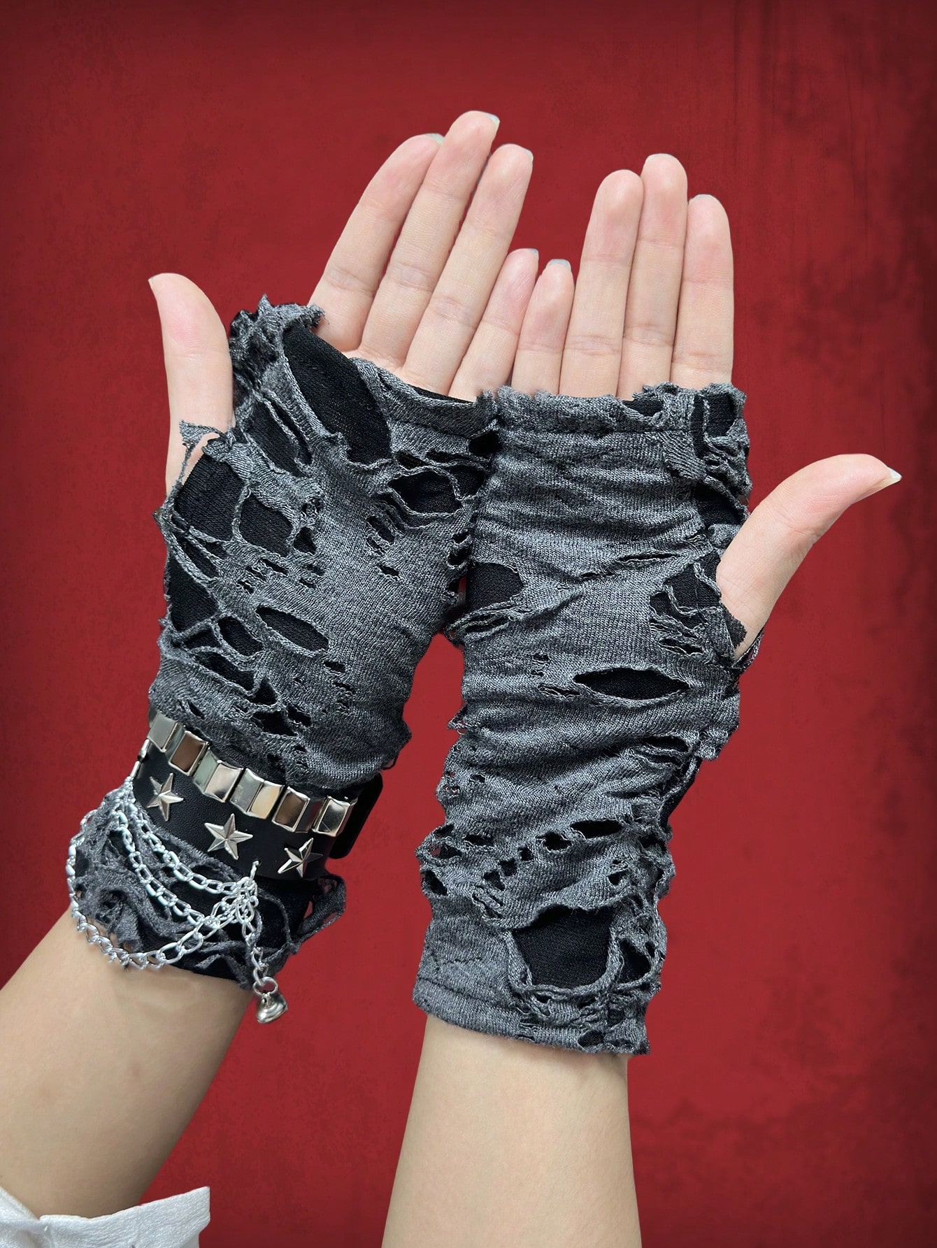 Goth 1pair Black Fingerless Gloves With Holes & 1pc Wide Cuff Bracelet With Star Rivets