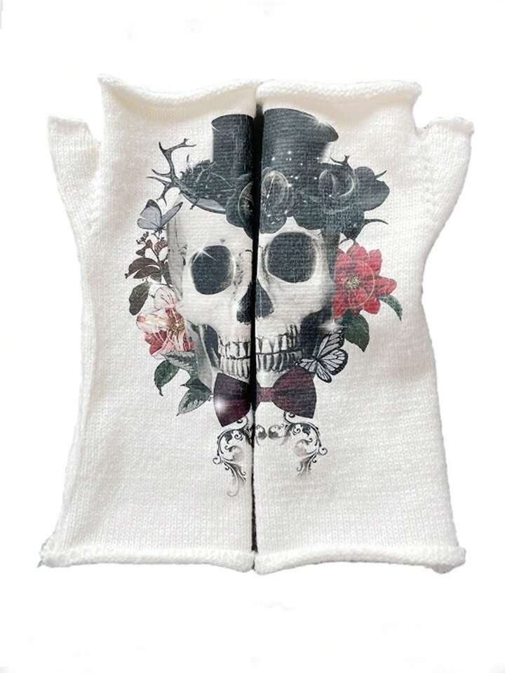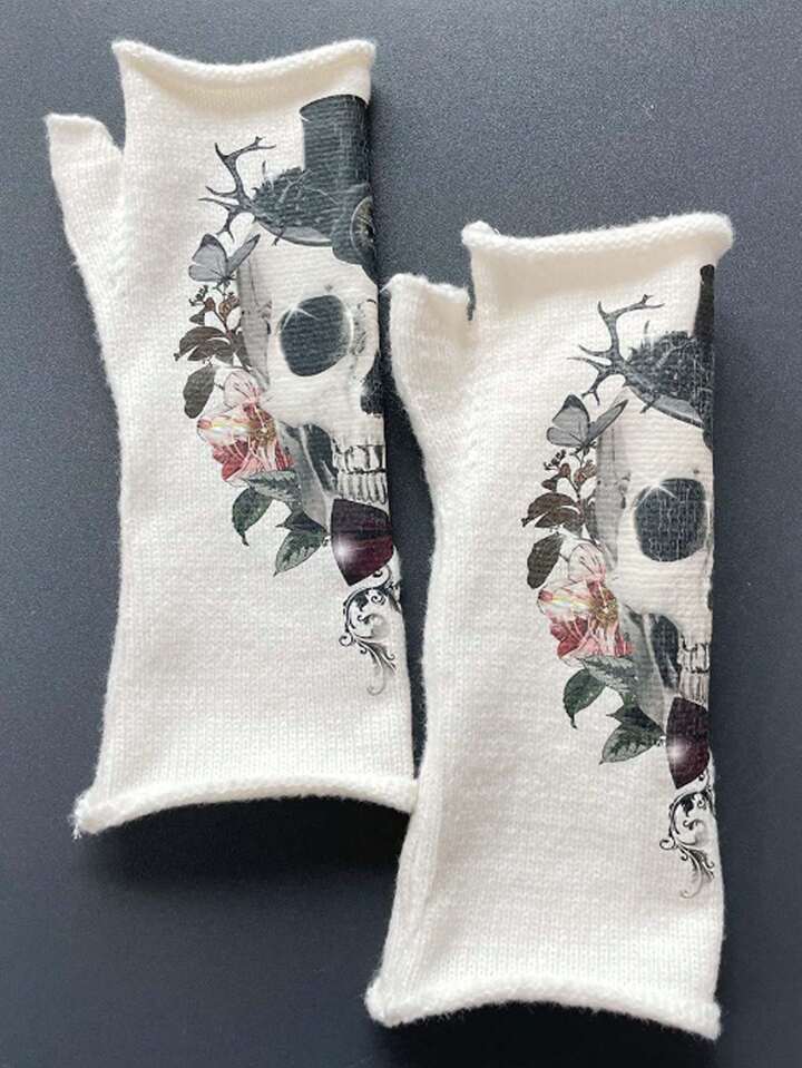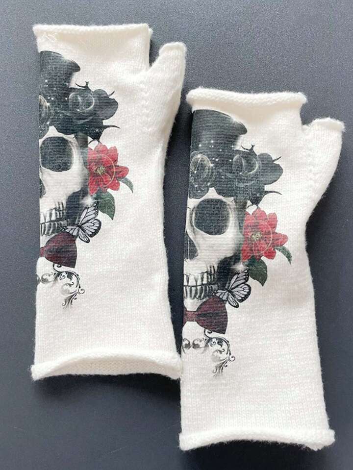 1pair Gothic Skull & Flower Pattern Fingerless Gloves For Women, Warm Winter Gloves, Halloween Accessory Gift