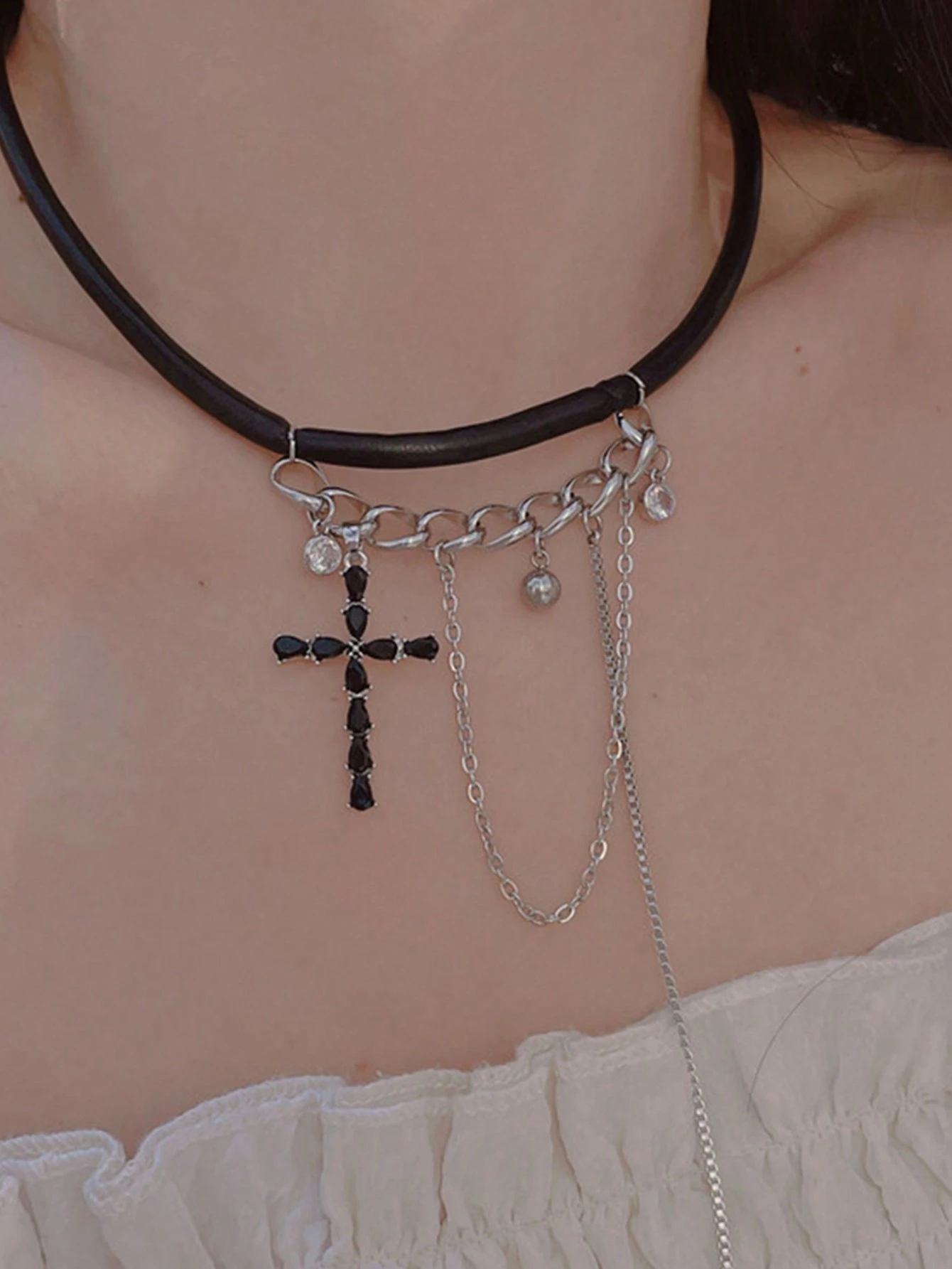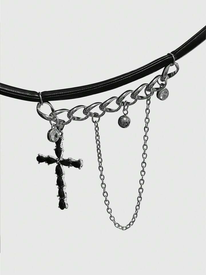 Goth 1pc Cross & Tassel & Bead Design Leather Cord Necklace