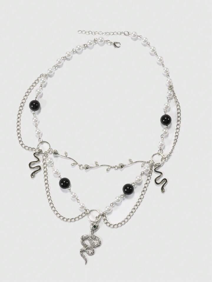 Goth 1pc Funky Copper Alloy Snake & Faux Pearl Decor Layered Chain Necklace For Women For Dating Gift