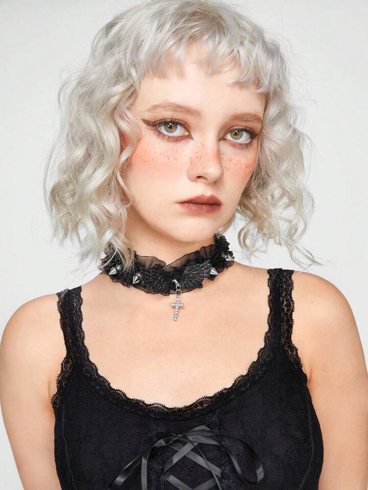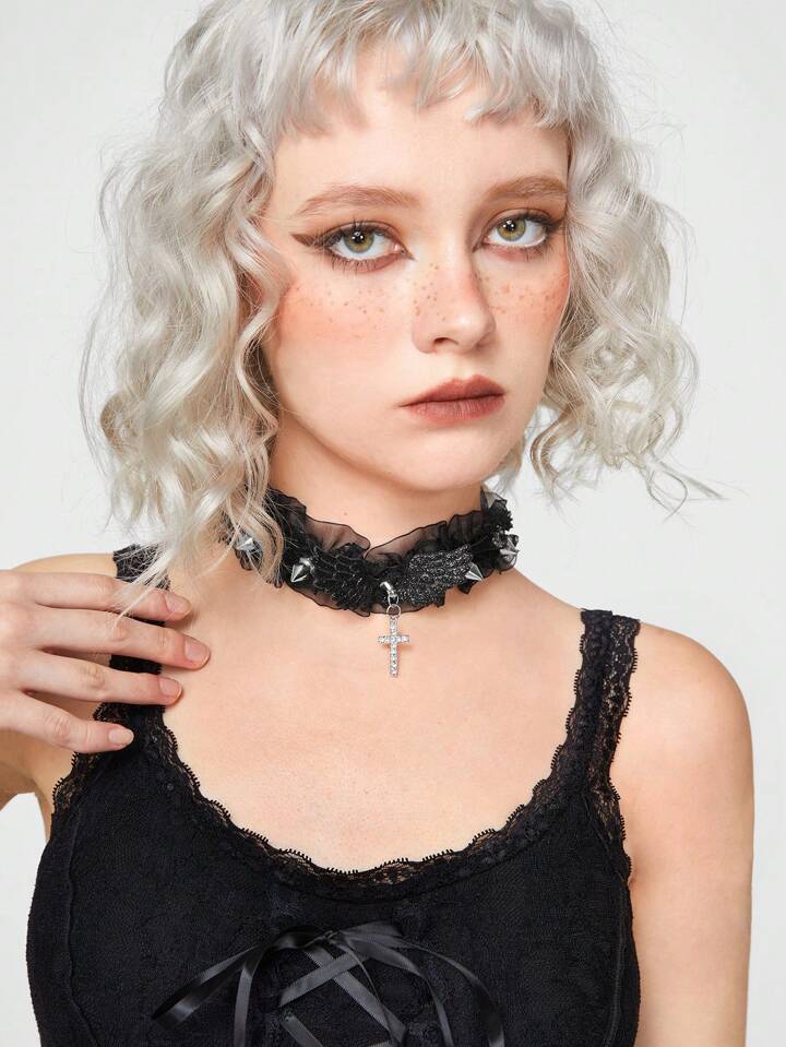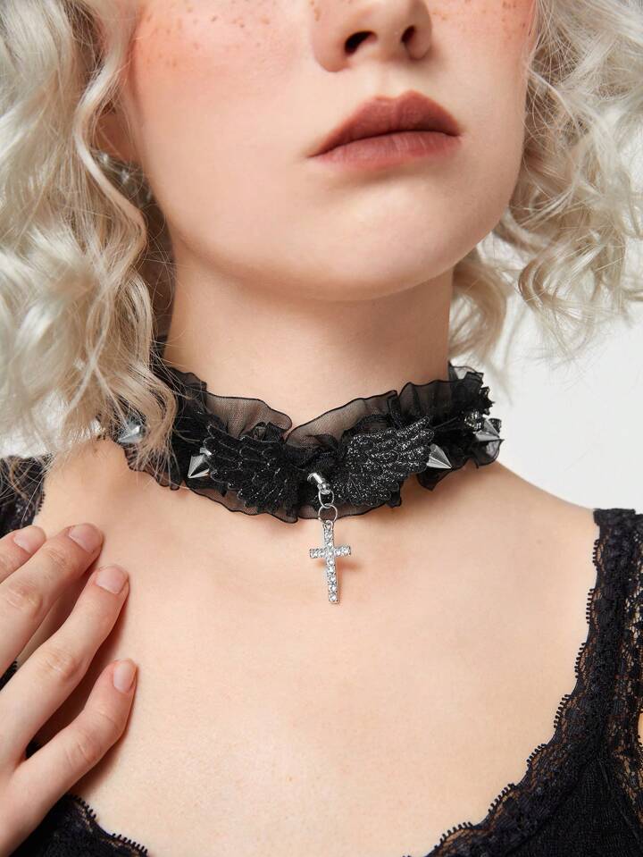 Goth 1pc Lace Trim Pendant Choker Necklace