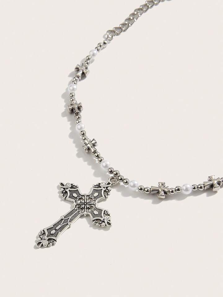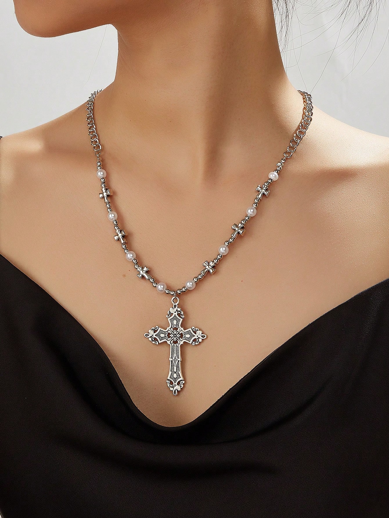 Goth 1pc Vintage Beaded Cross Pendant Necklace