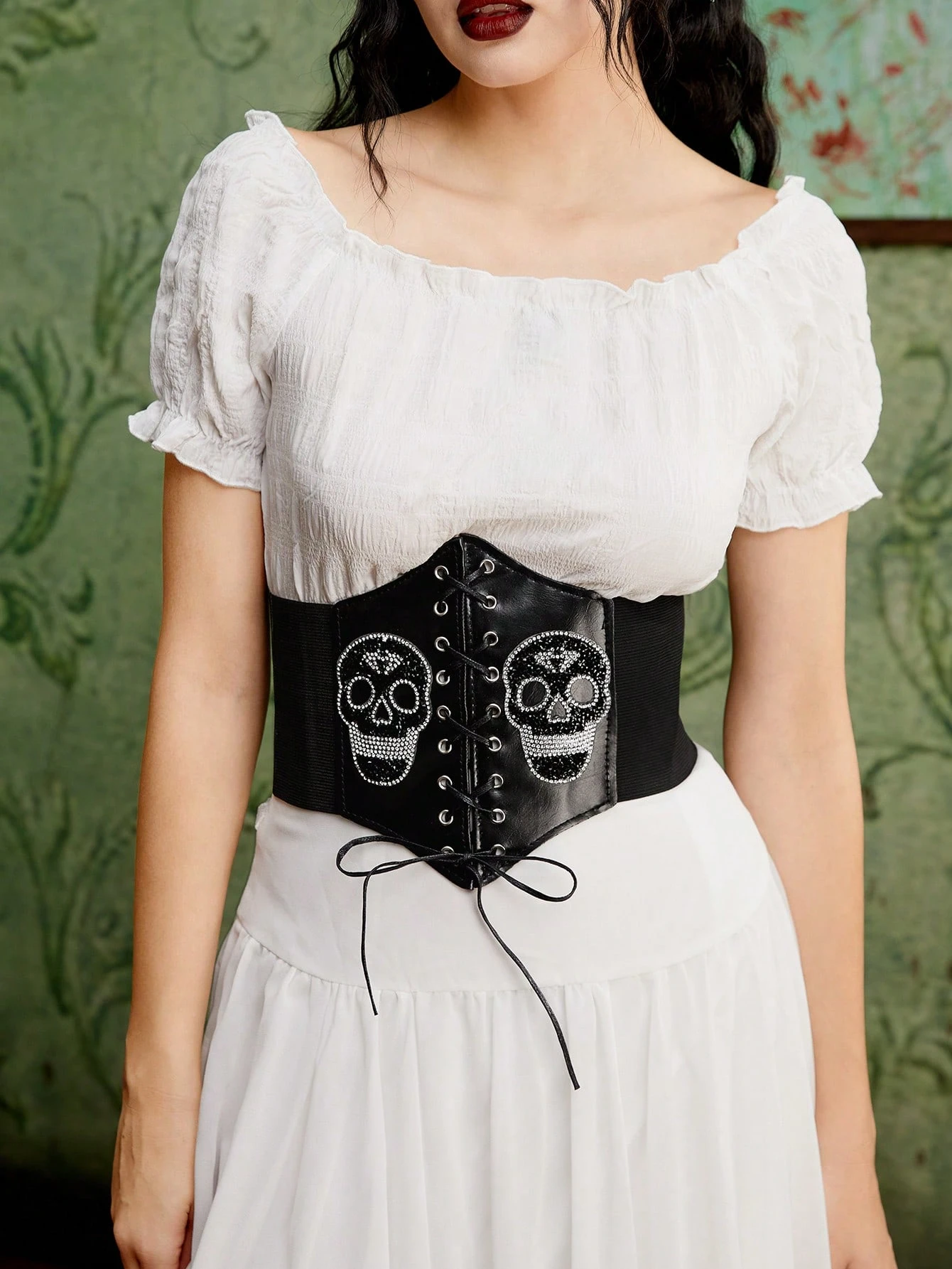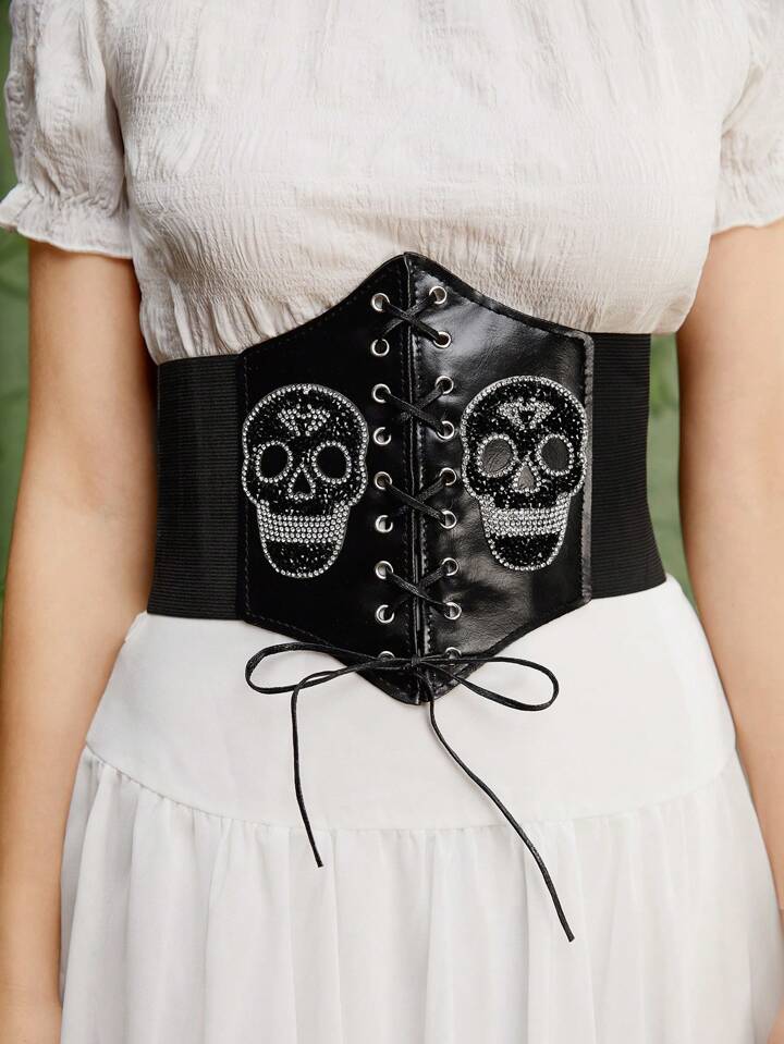 Goth 1pc Women Skull Rhinestone Decor Lace Up Corset Belt