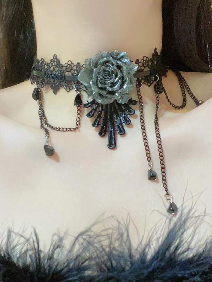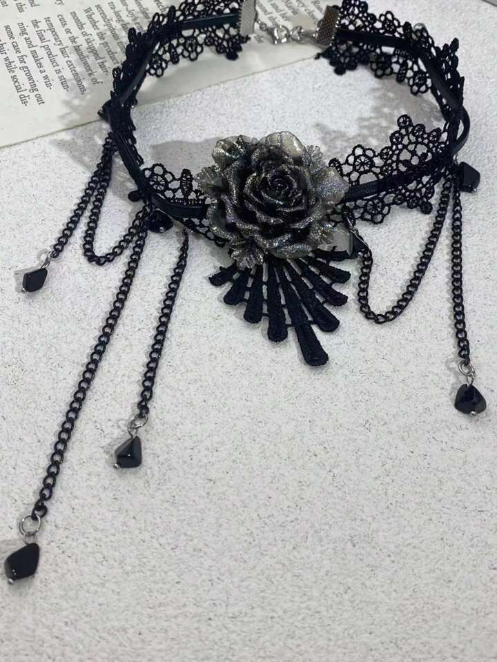 Goth 1pc Women's Black Lace Rose Crystal Tassel Choker Necklace
