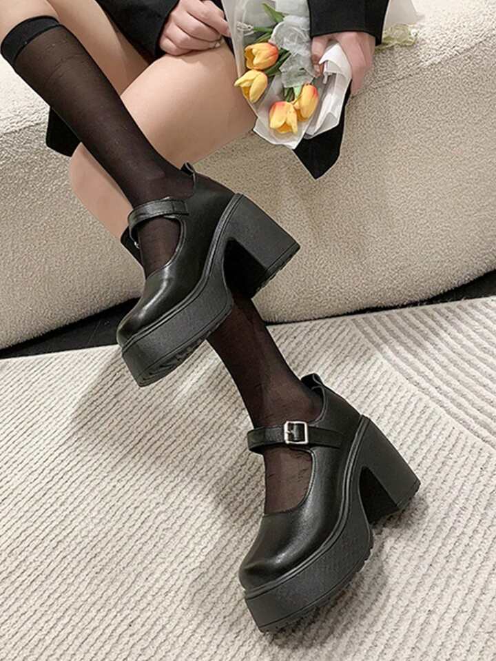 Goth 2023 Women's New Arrival Round Toe Black College Style Jk Uniform Single Strap High Heels & Thick Sole Shoes