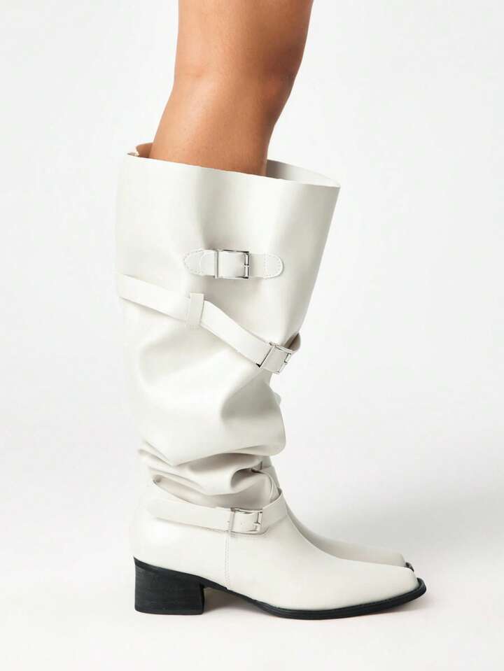 Goth 2025 New Fashion Pointed Toe Thick Heel PU Leather Buckle Strap Thigh High Boots, Suitable For Autumn/Winter