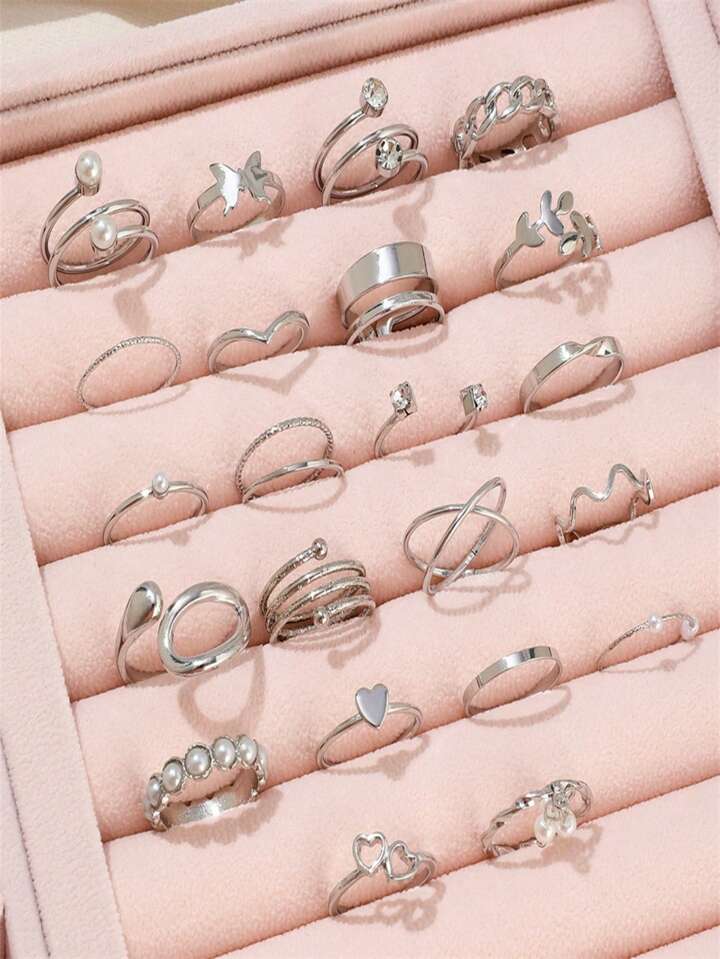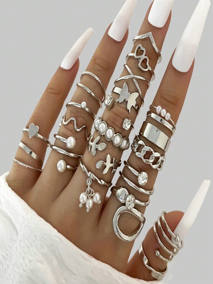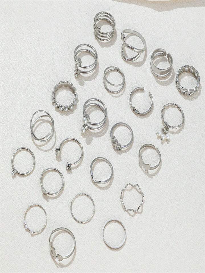 Goth 22pcs Fashion Zinc Alloy Faux Pearl Decor Chain Ring For Women For Daily Decoration