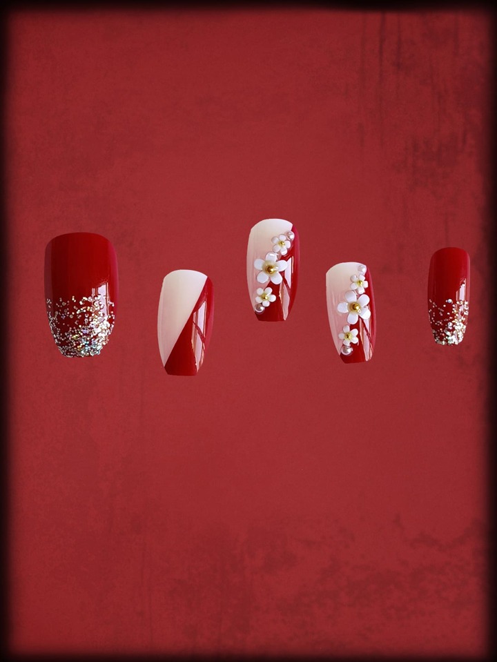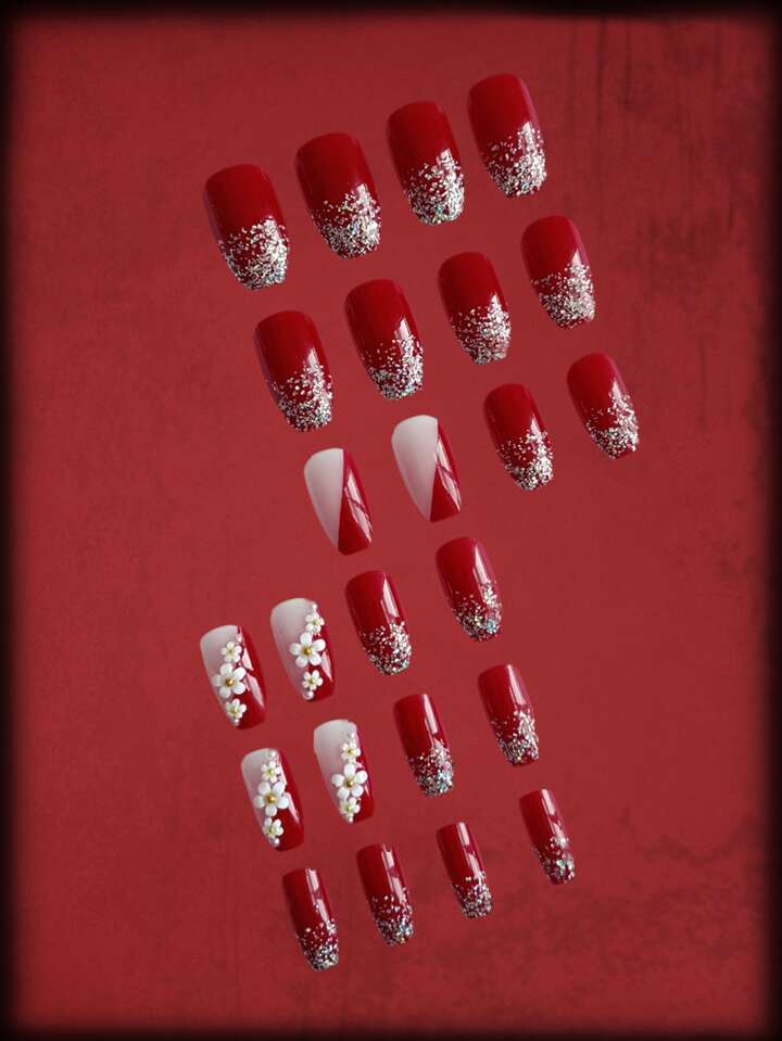 Goth 24pcs Coffin Flower Decor Fake Nail & 1sheet Nail Tape