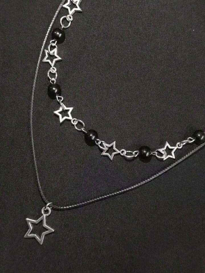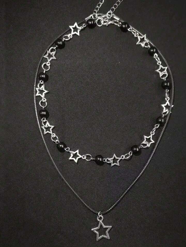 Goth 2pcs Bohemian Style Simple Faux Pearl Hollow Out Five-Pointed Star Charm Collarbone Necklace Set Fashionable Star & Round Beaded Necklaces For Women