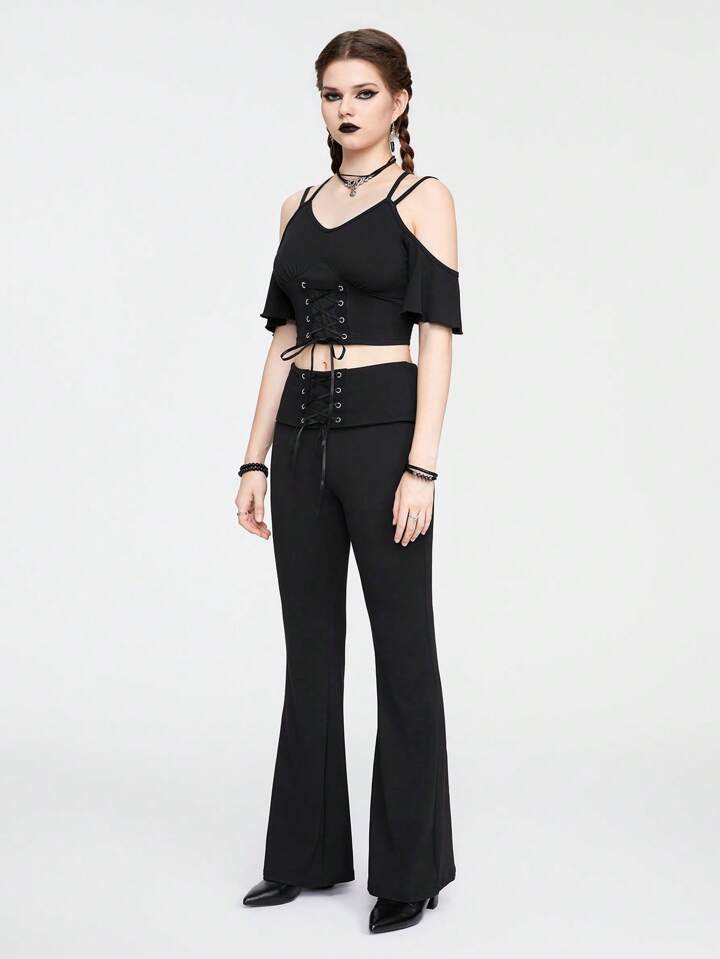 Goth 2pcs Solid Color Ruffle Hem Cami Top And Flared Pants Set With Bow Bust Tie