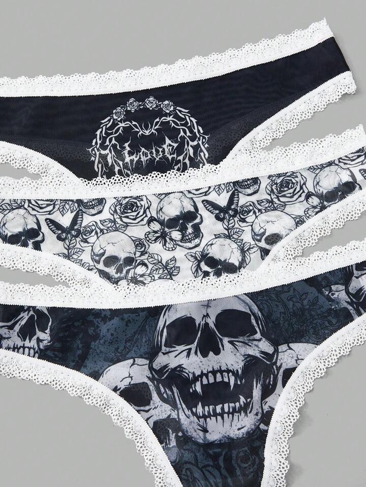 Goth 3pack Skull Print Contrast Lace Thong Set