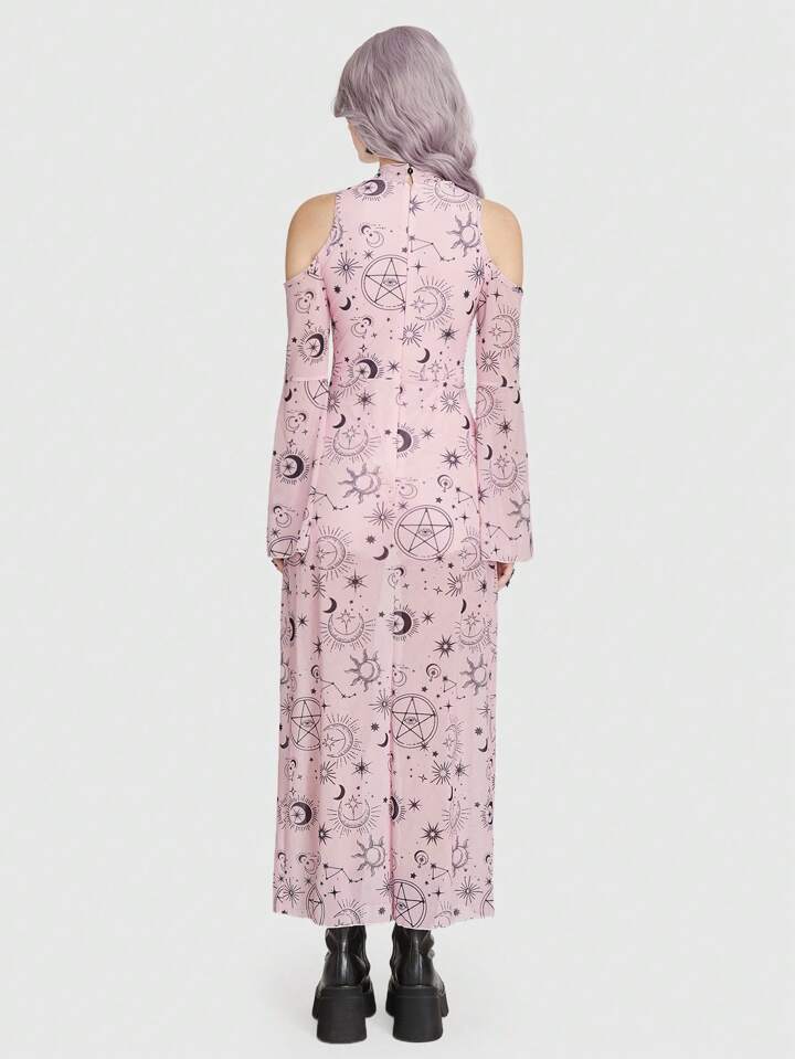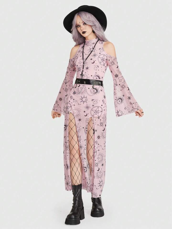 Goth Allover Print Cold Shoulder Flounce Sleeve Split Thigh Dress Without Belt