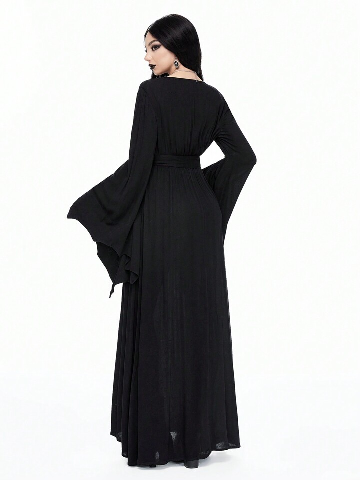 Goth Bat Print Asymmetrical Bell Sleeve Bodycon Midi Dress For Women