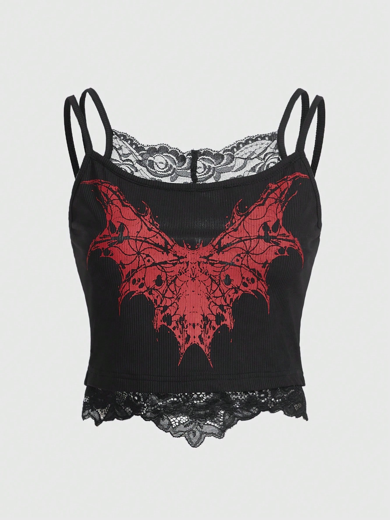 Goth Bat Print Contrast Lace Cami Top
