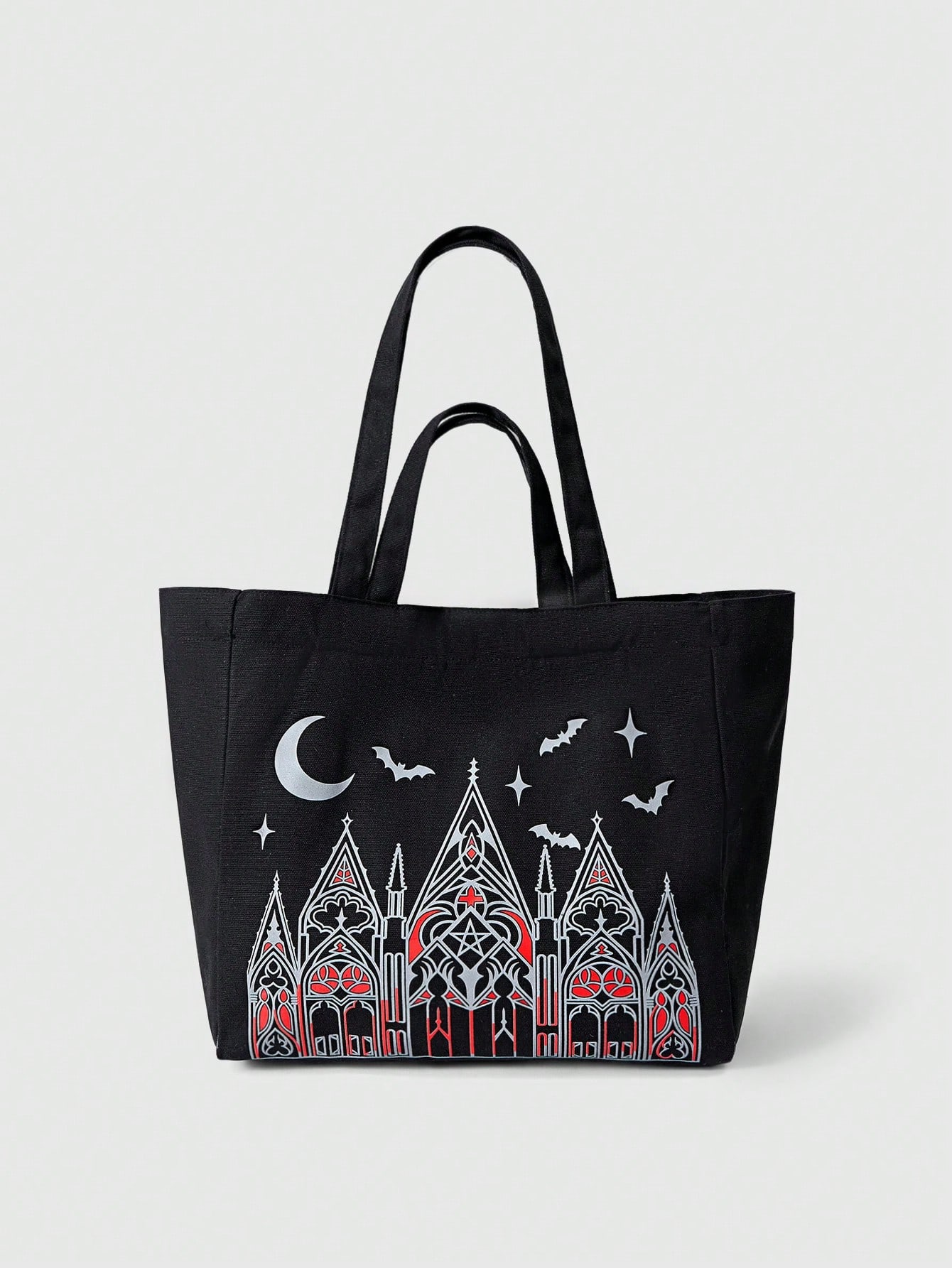 Goth Castle & Church Print Canvas Tote Bag, Solid Color, Lightweight Shopping Bag, Suitable For Outing And Travel, Large Capacity, Foldable, Fashionable Gift, Autumn/Winter