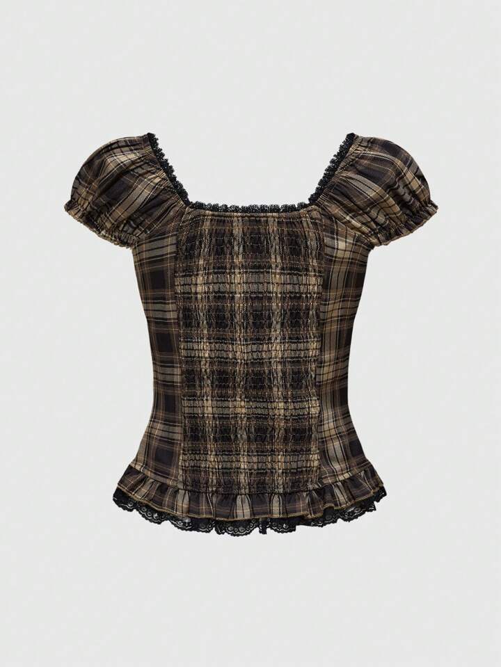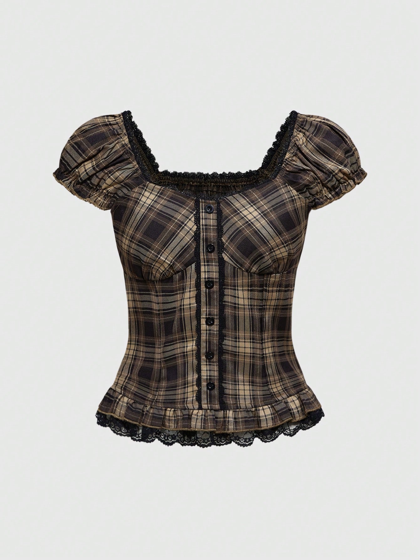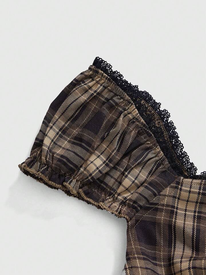 Goth College Style Women's Plaid Shirt With Ruffled Hem And Puff Sleeves