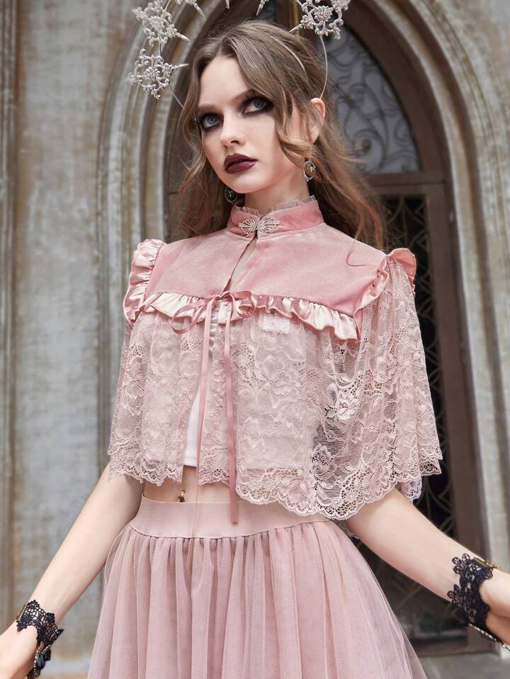 Goth Contrast Lace Ruffle Trim Tie Front Cape Sleeve Top