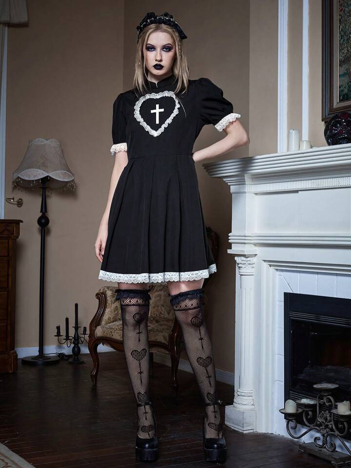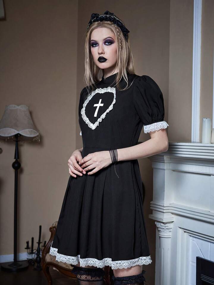 Goth Cross Print Contrast Lace Pleated Hem Dress