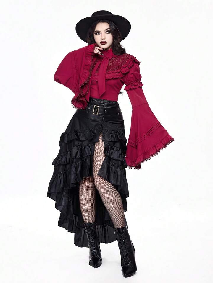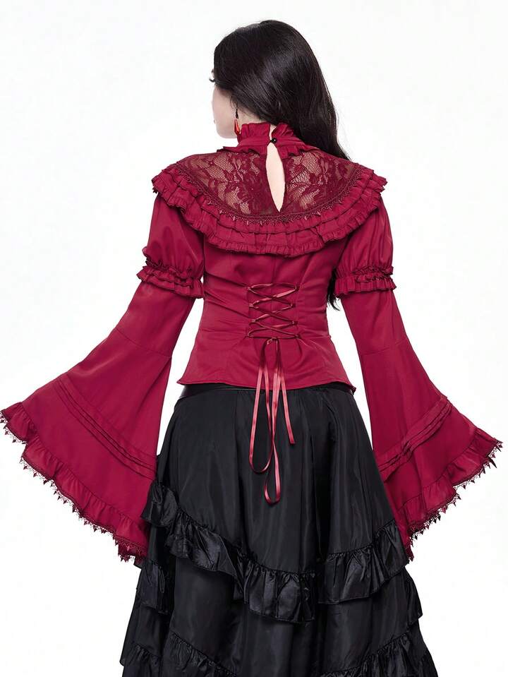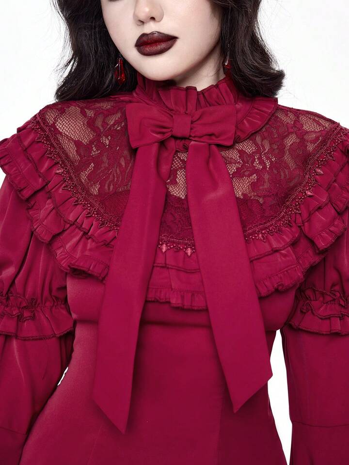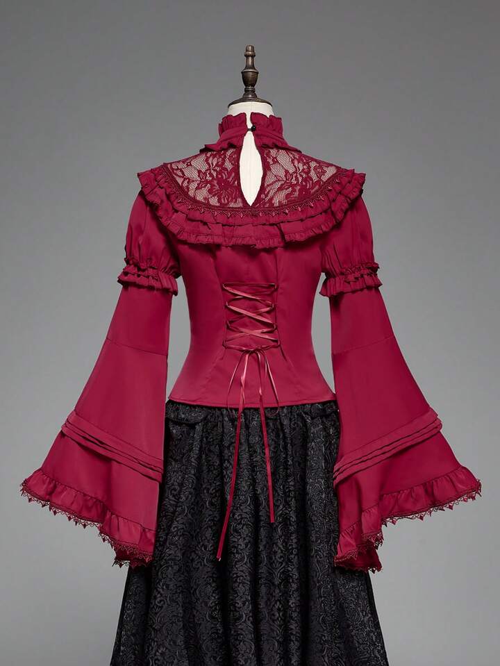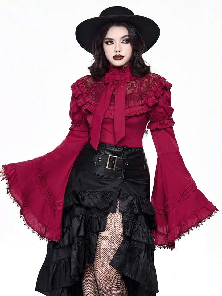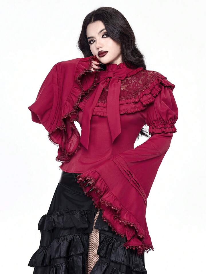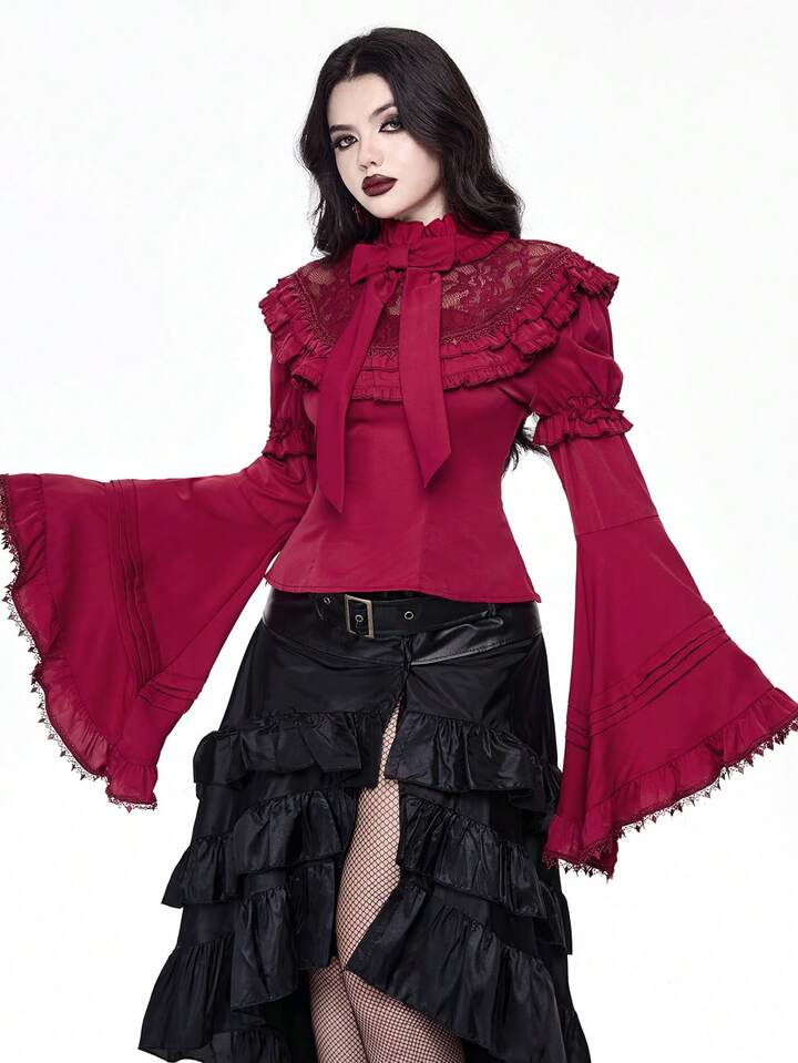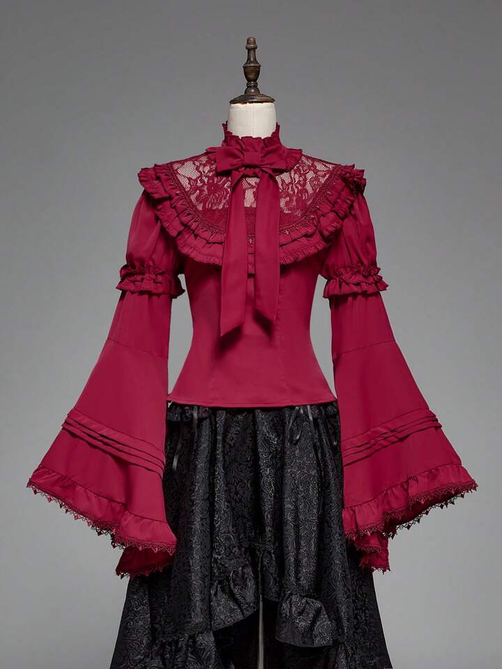 Goth Elegant Palace Style Lace Trim Extra-Wide Bell Sleeve Lolita Christmas Fitted Bow Blouse