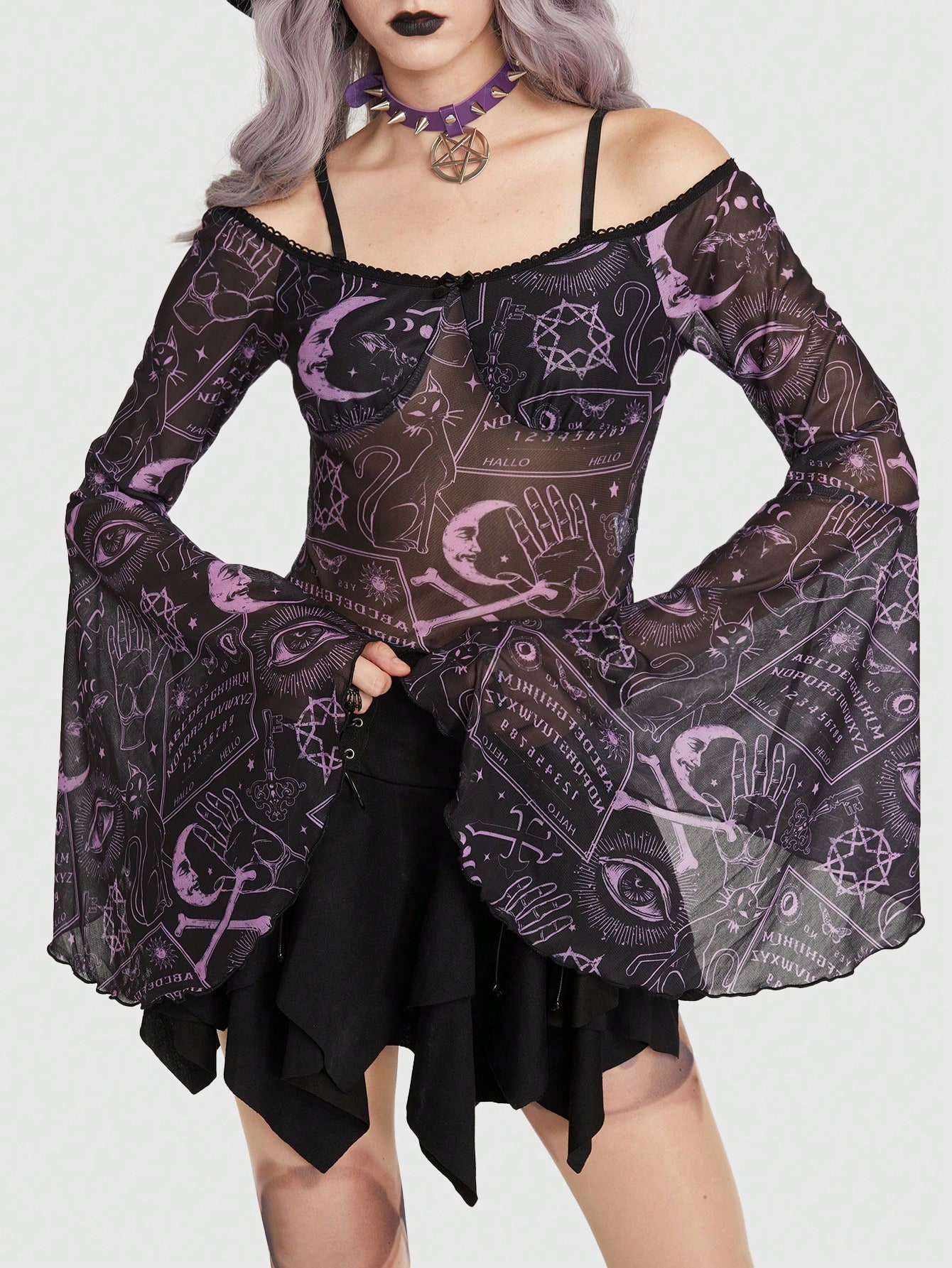 Goth Eye & Moon Print Cold Shoulder Flare Sleeve Sheer Top
