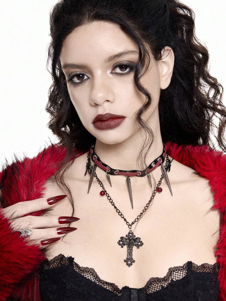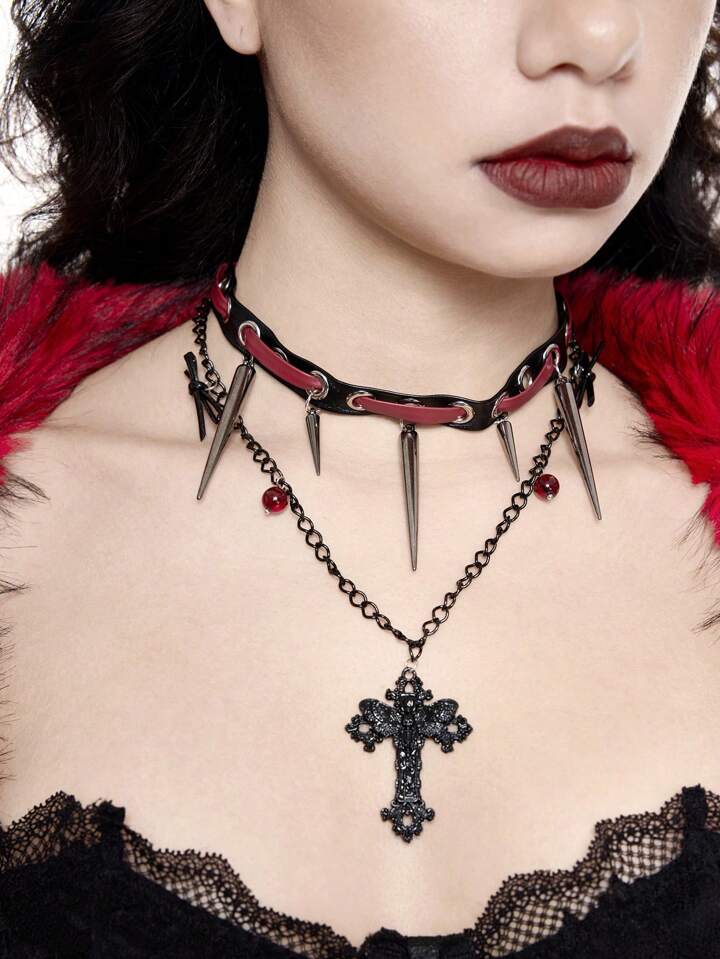 Goth Fashionable Punk Style Metal Leather Studded Cross Pendant Necklace